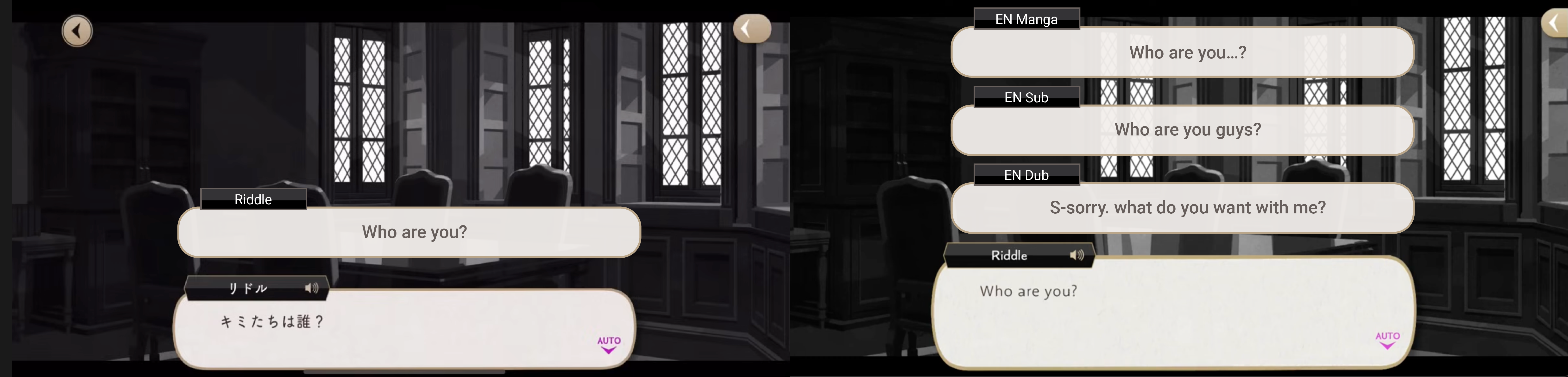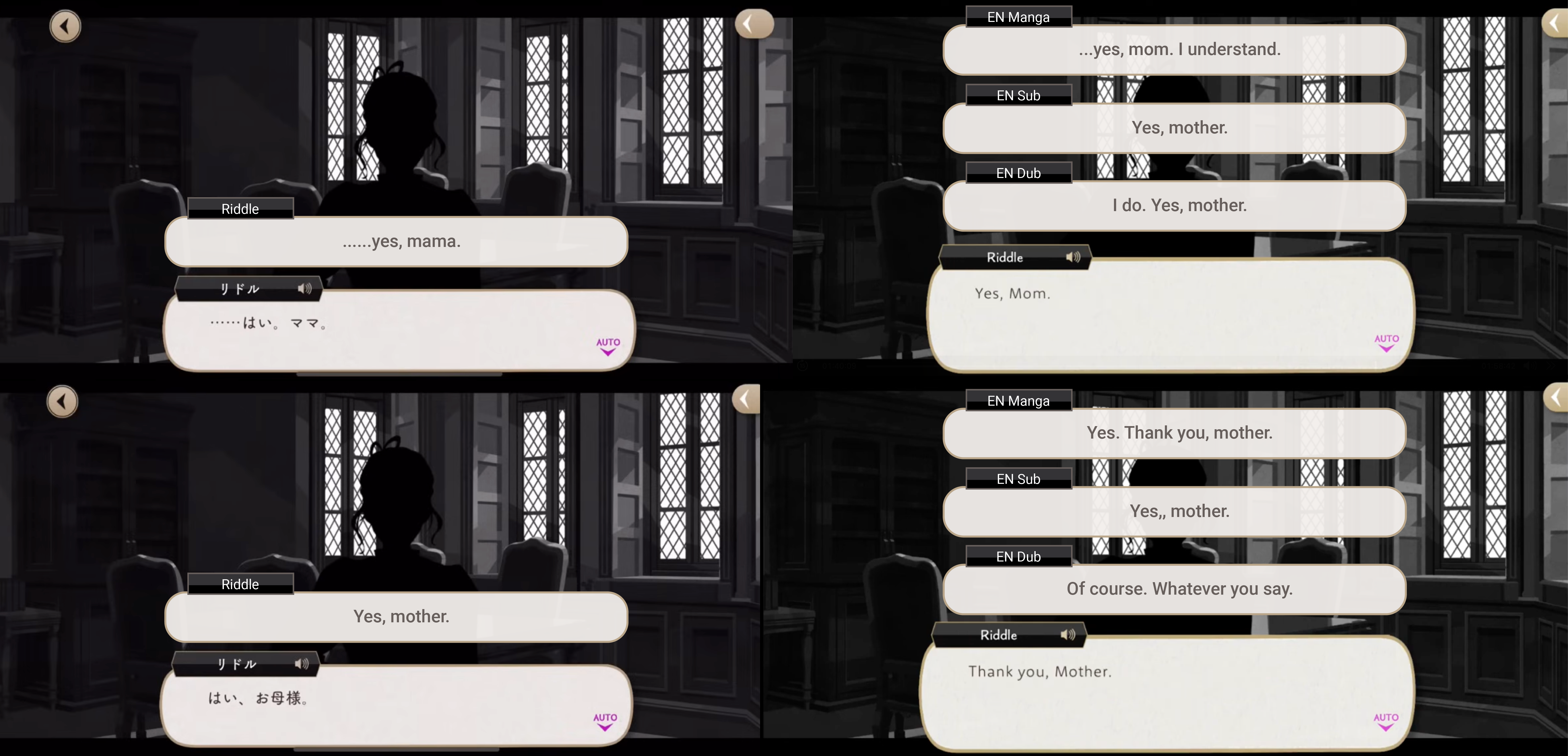 The EN manga and EN game also rewrote this section of Riddle repeating only “Yes, mother,” when spoken to: