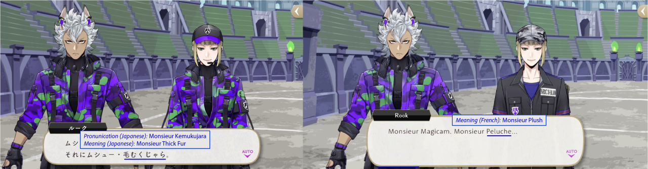 (Rook’s nickname for Grim in the original game and anime is the same. His name for Grim in the EN game is Monsieur Peluche.)