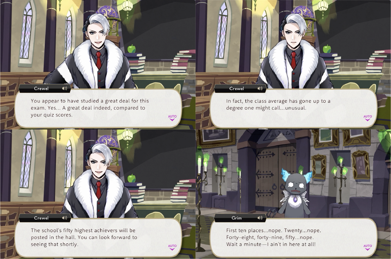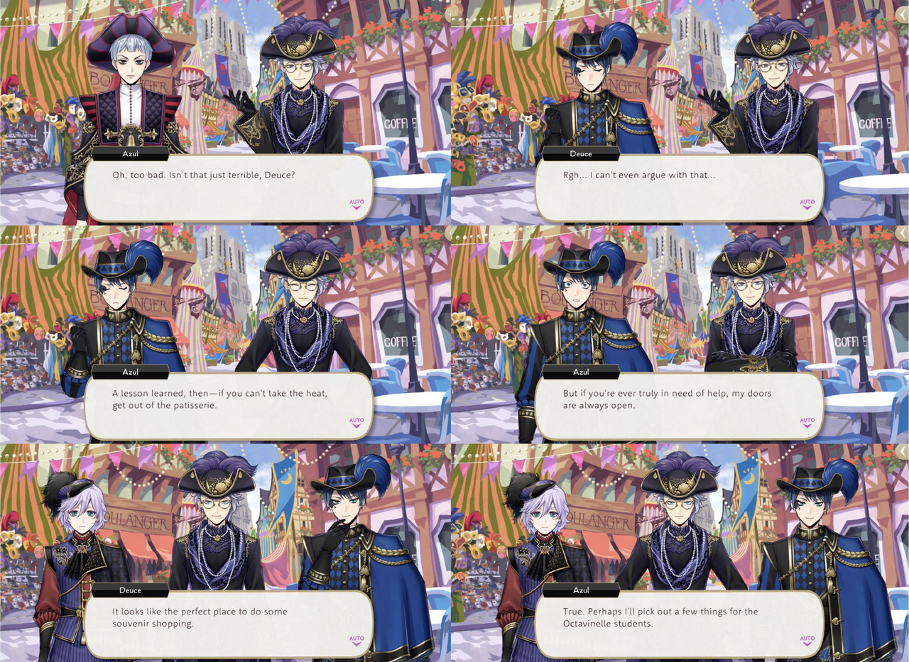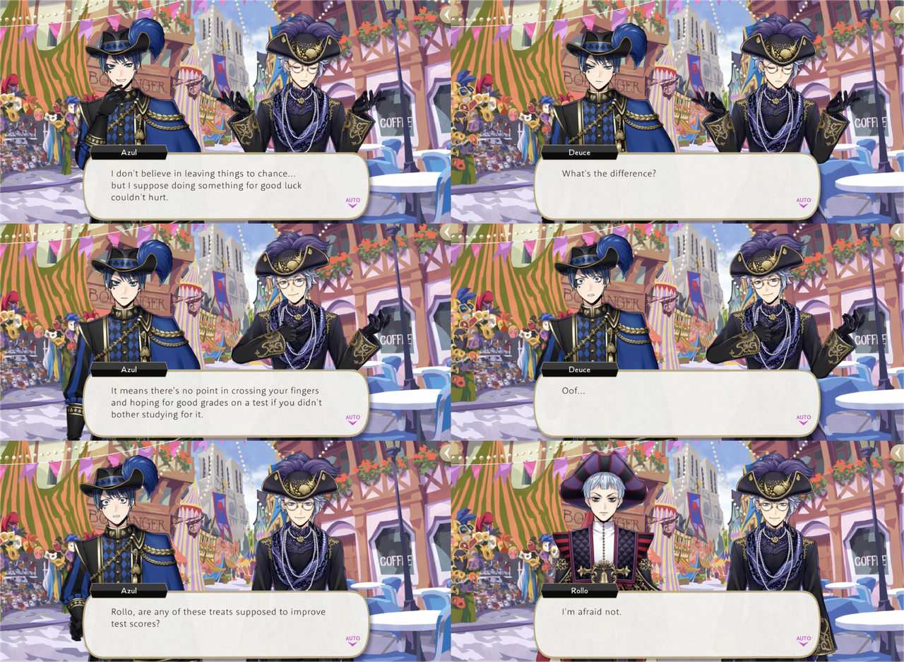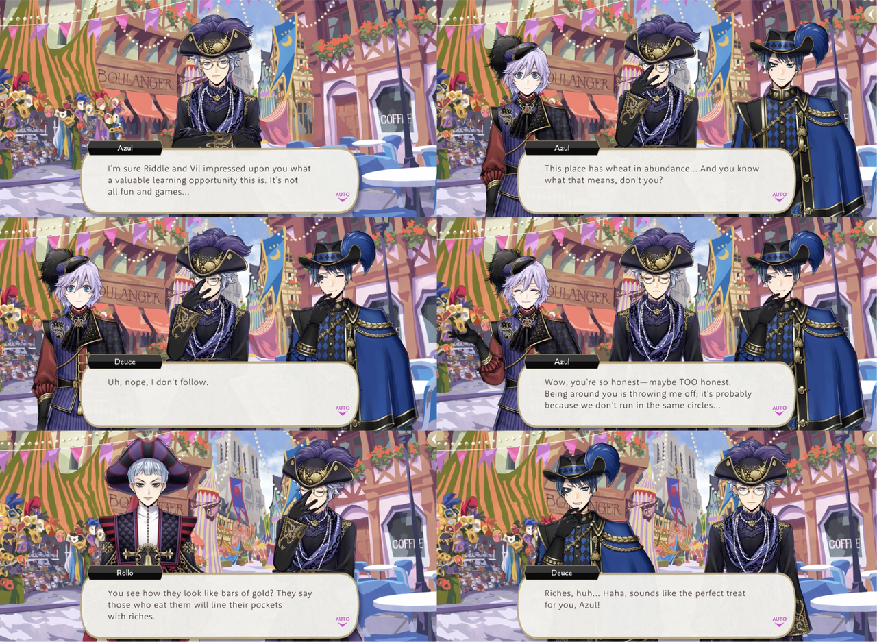Rollo explains financiers by saying, “They say those who eat them will line their pockets with riches” Deuce teases Azul with, “sounds like the perfect treat for you,” but Azul turns it back onto Deuce with an explanation of the difference between luck and chance: “It means there’s no point in crossing your fingers and hoping for good grades on a test if you didn’t bother studying for it,” and when Rollo confirms that there are no treats for improving test scores he observes, “Isn’t that just terrible, Deuce?” (Deuce: “Rgh… I can’t even argue with that…” – Azul: “But if you’re ever truly in need of help, my doors are always open.”)
