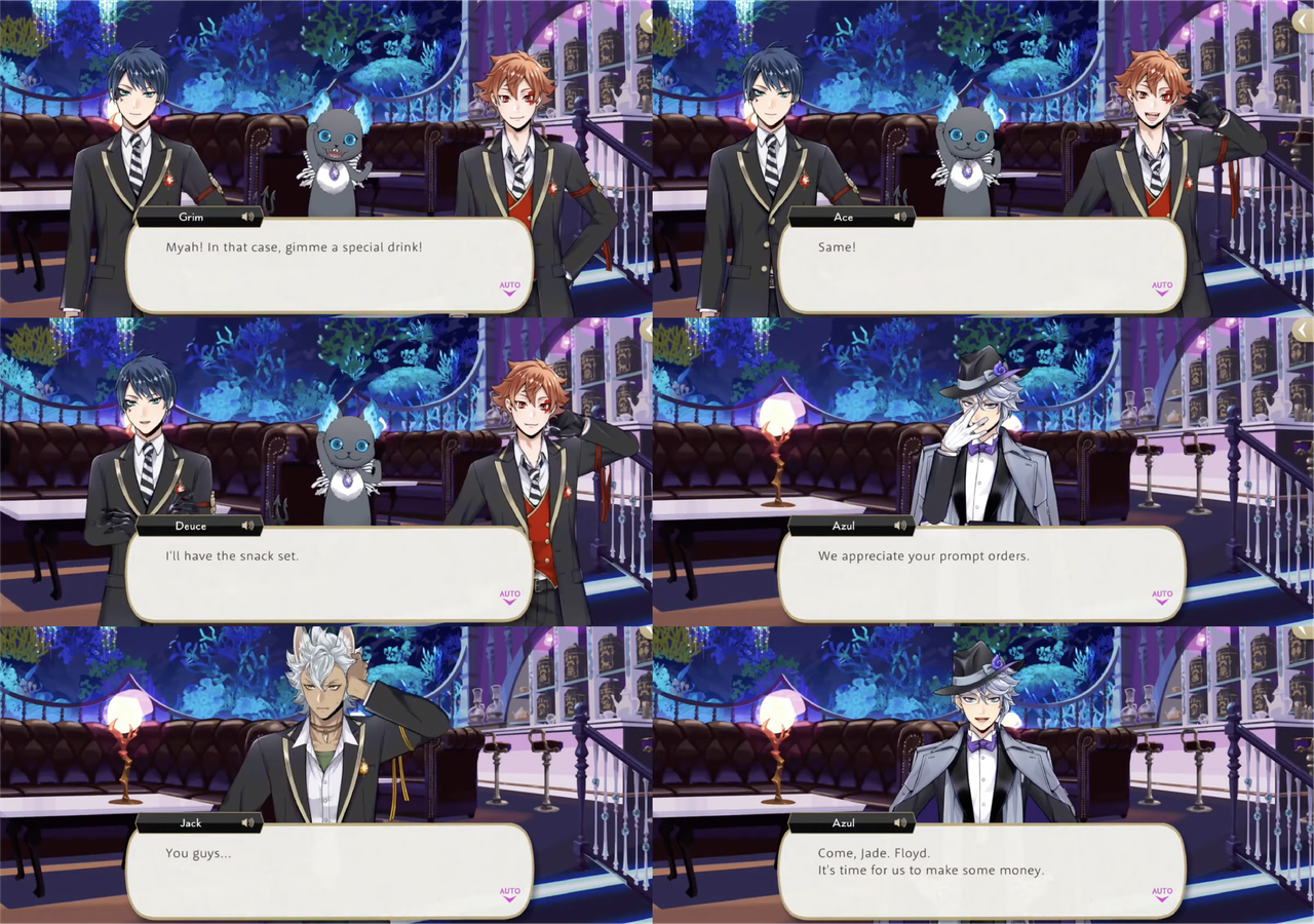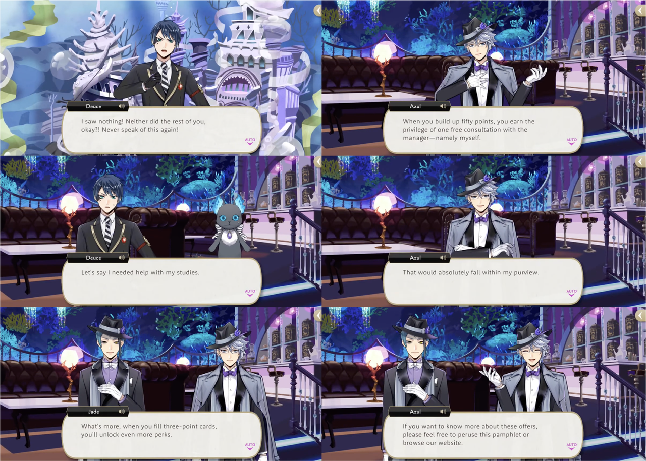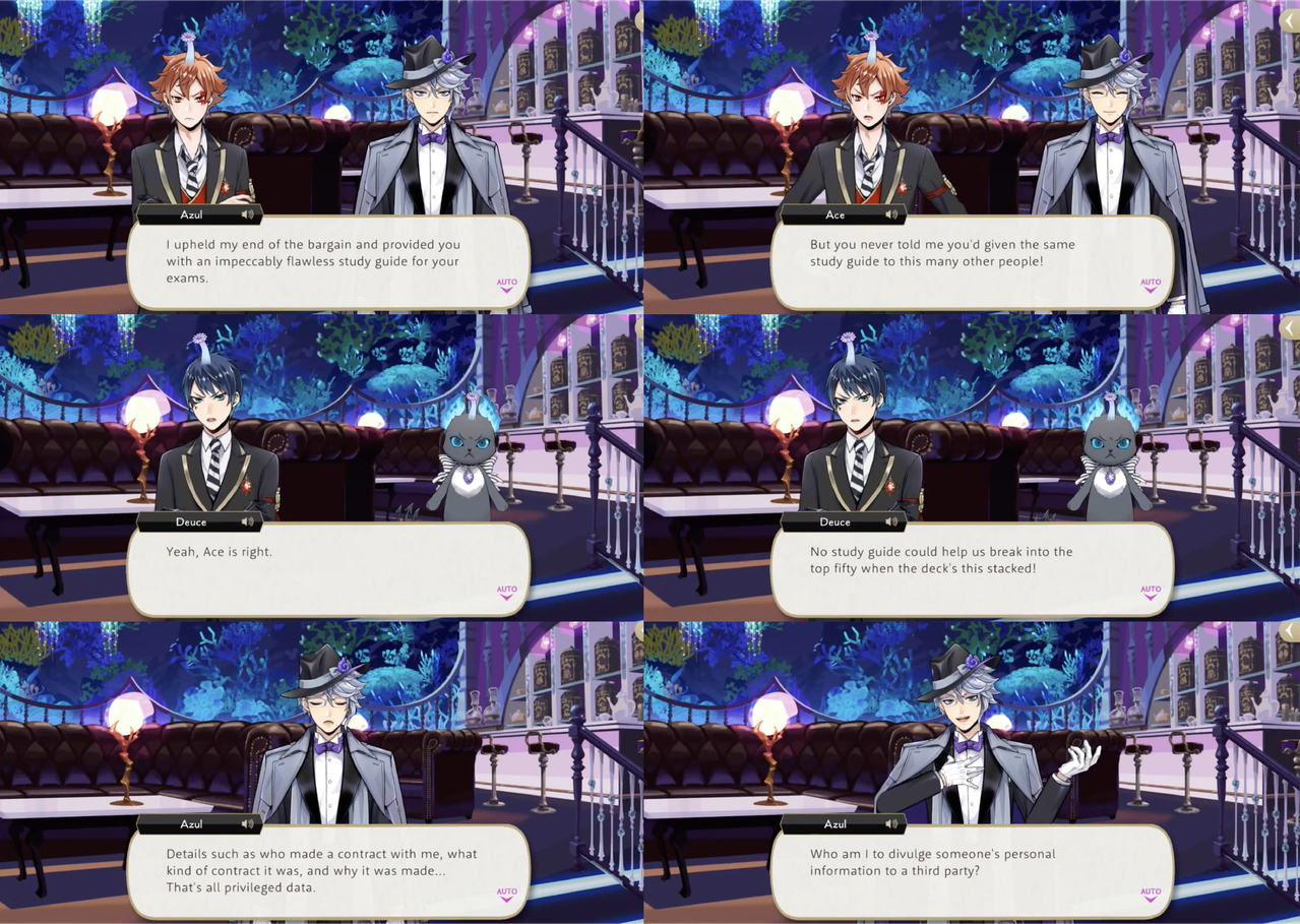 After Deuce’s contract is dissolved, he is quick to take Azul up on his next offer: free consultations for those who spend enough money on food and drinks at Mostro Lounge. Deuce asks, “Let’s say I needed help with my studies,” and Azul responds, “That would absolutely fall within my purview.”