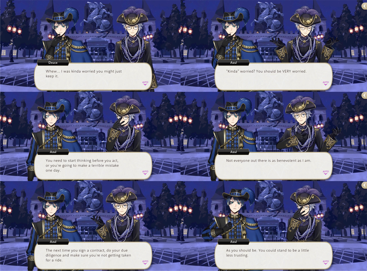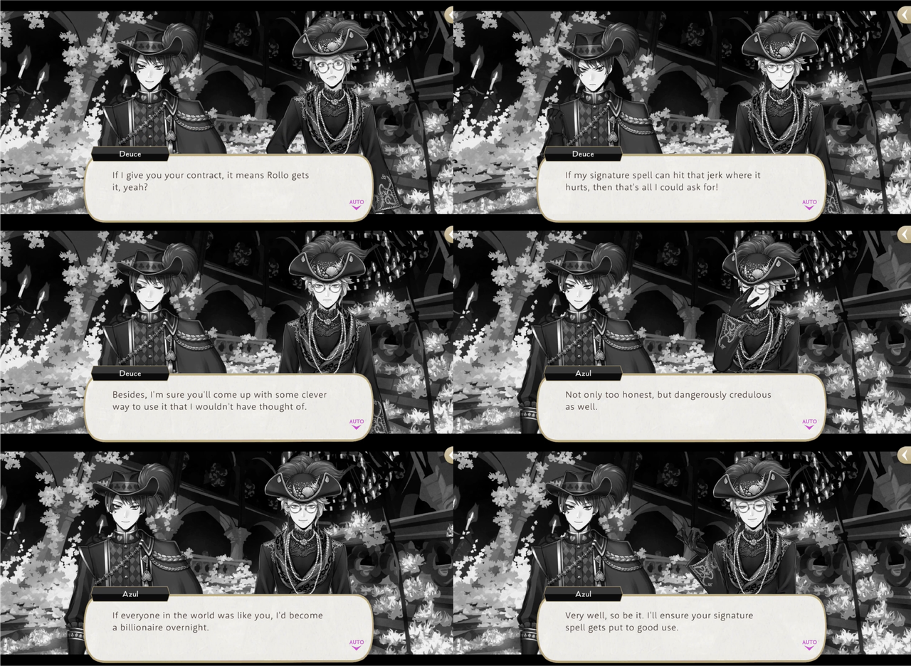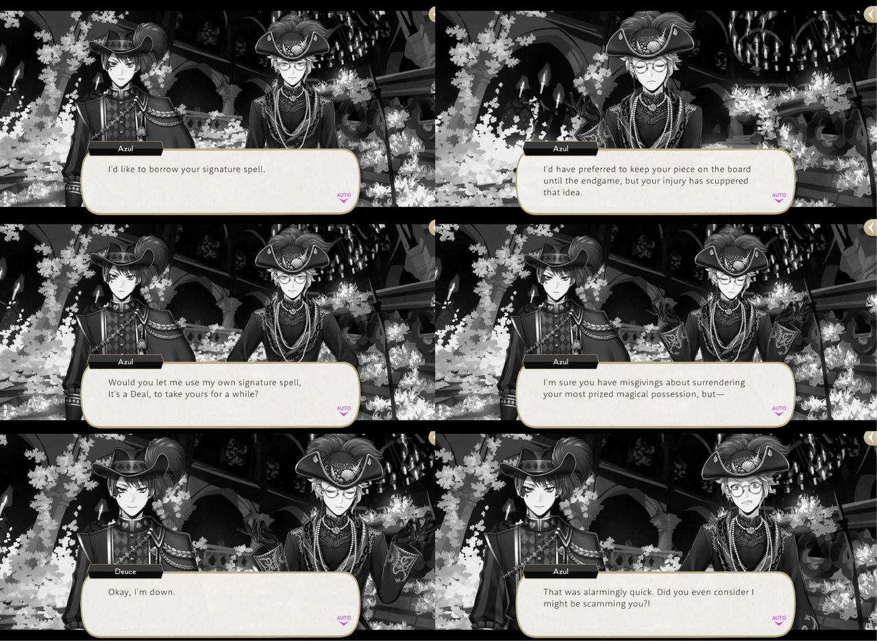 Azul asks, “Did you even consider I might be scamming you?!,” but Deuce says all he wants is for Azul to hit Rollo where it hurts, adding, “Besides, I’m sure you’ll come up with some clever way to use it that I wouldn’t have thought of.” Azul responds, “If everyone in the world was like you, l’d become a billionaire overnight.”
