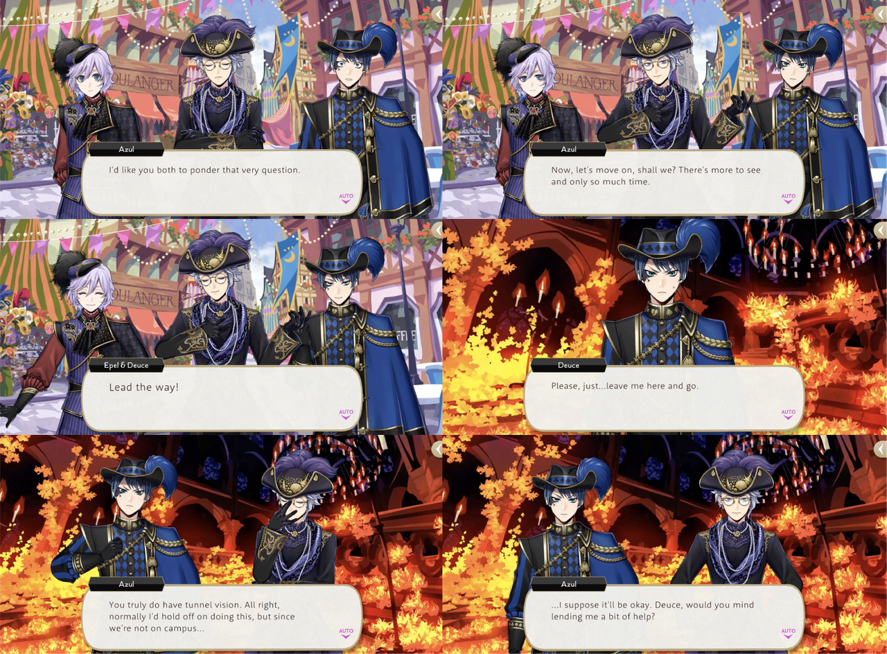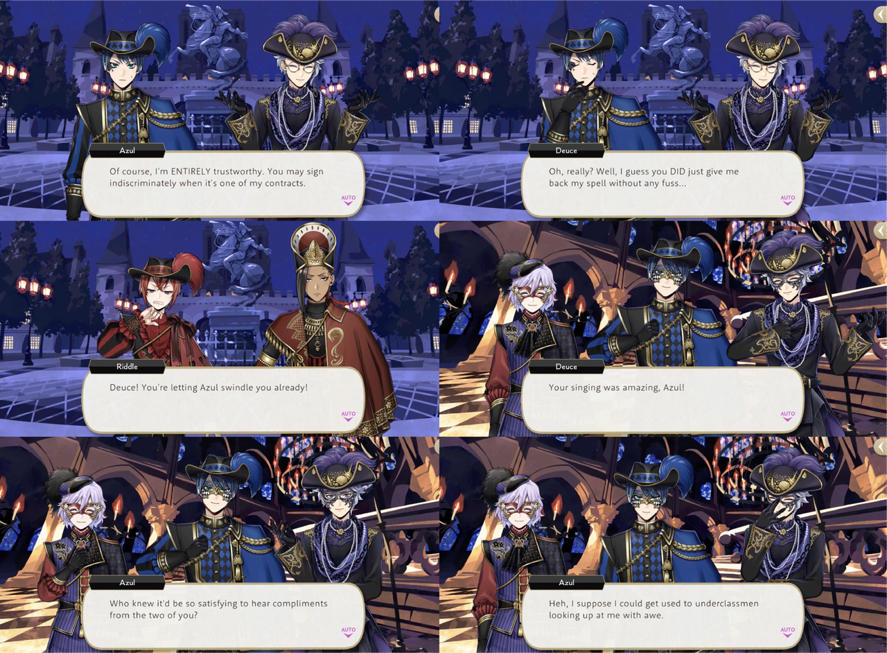 After the performance at the social Deuce and Epel approach Azul to compliment his singing. Azul observes, “Who knew it’d be so satisfying to hear compliments from the two of you? I suppose I could get used to underclassmen looking up at me with awe.”
