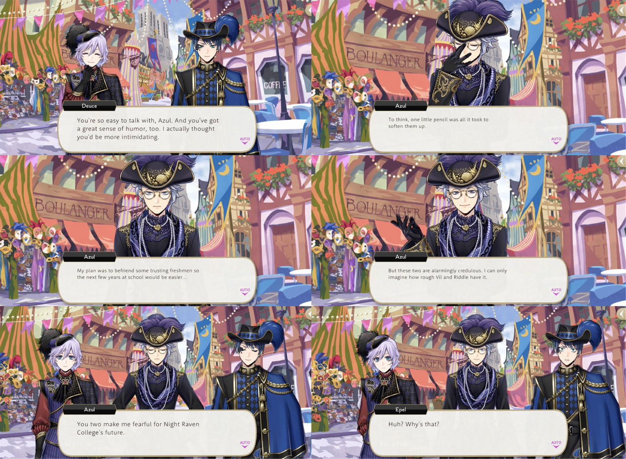 Azul quietly reflects, “To think, one little pencil was all it took to soften them up. My plan was to befriend some trusting freshmen so the next few years at school would be easier…But these two are alarmingly credulous. I can only imagine how rough Vil and Riddle have it.” He tells both students directly, “You two make me fearful for Night Raven College’s future,” and asks them to ponder on why.