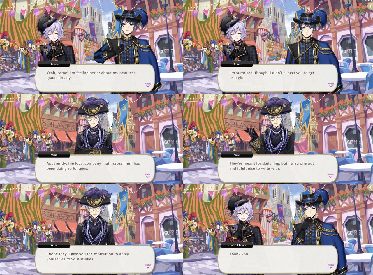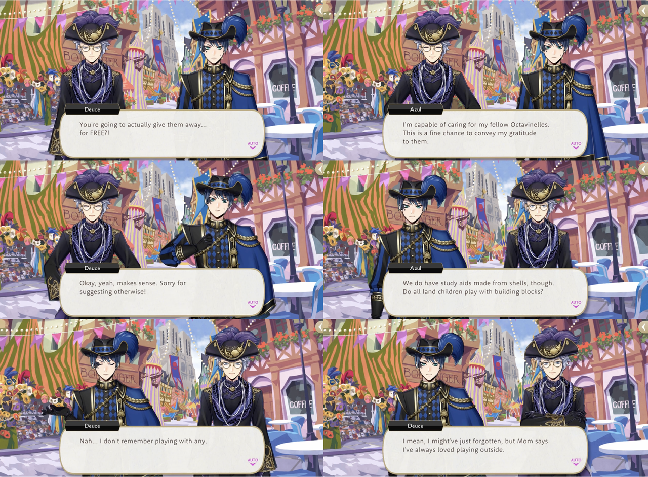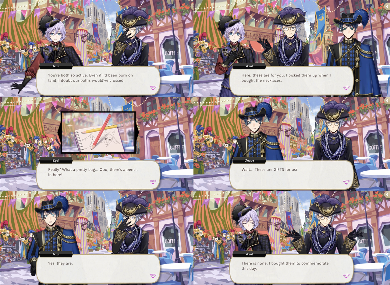 Deuce is shocked to learn that Azul intends to purchase gifts for the students of Octavinelle, and apologized for assuming others.
