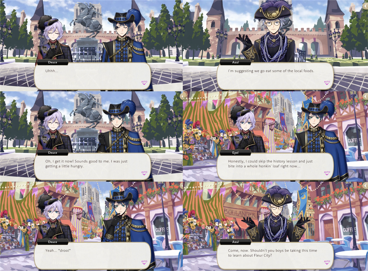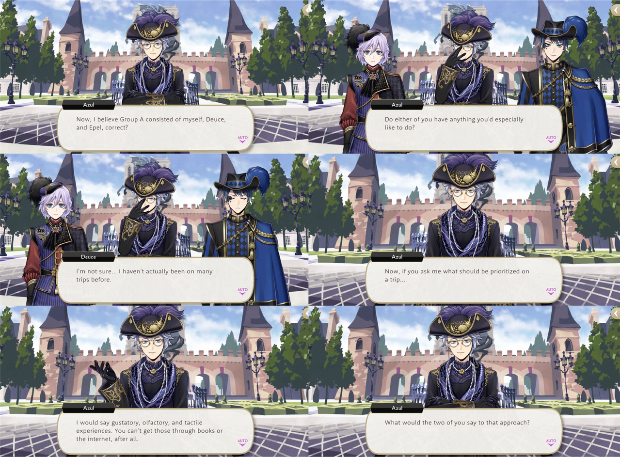 Azul is in a group with Deuce and Epel for Glorious Masquerade, At the start of the day he declares, “I would say gustatory, olfactory, and tactile experiences. You can’t get those through books or the internet, after all. I believe cuisine is the most efficient way to understand a local culture since it develops according to the region’s very soul.” When the two younger students are confused he explains, “I’m suggesting we go eat some of the local foods,” and they agree.