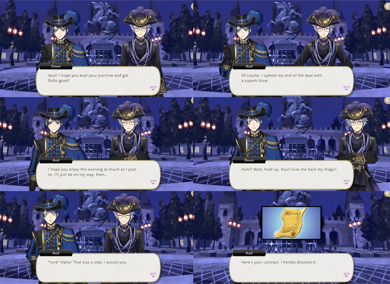 At the end of the event Azul teases Deuce, pretending to excuse himself from the scene without returning Deuce’s unique magic. Azul ultimately does dissolve the contract, and Deuce admits he had been worried that Azul had intended to keep the spell.