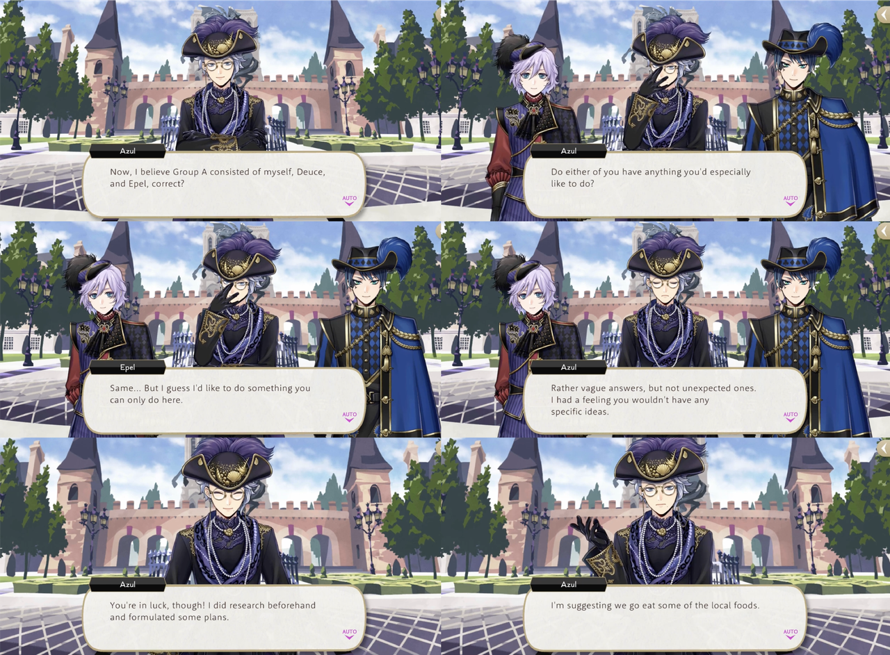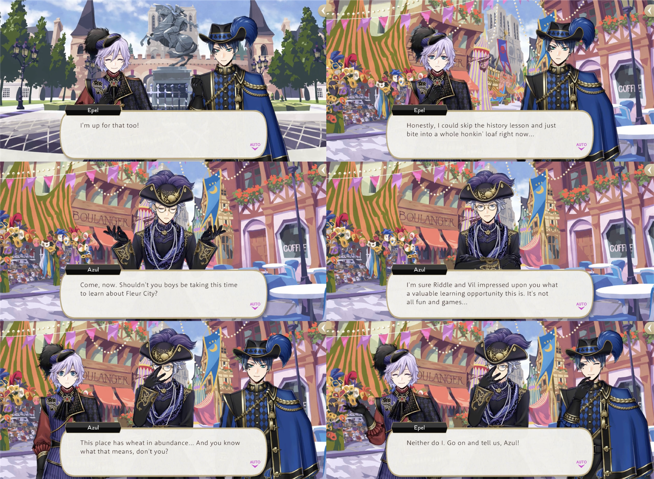 Despite being the one who suggests that they try local cuisine, Azul scolds the two younger students when they are more interested in food than Fleur city itself.