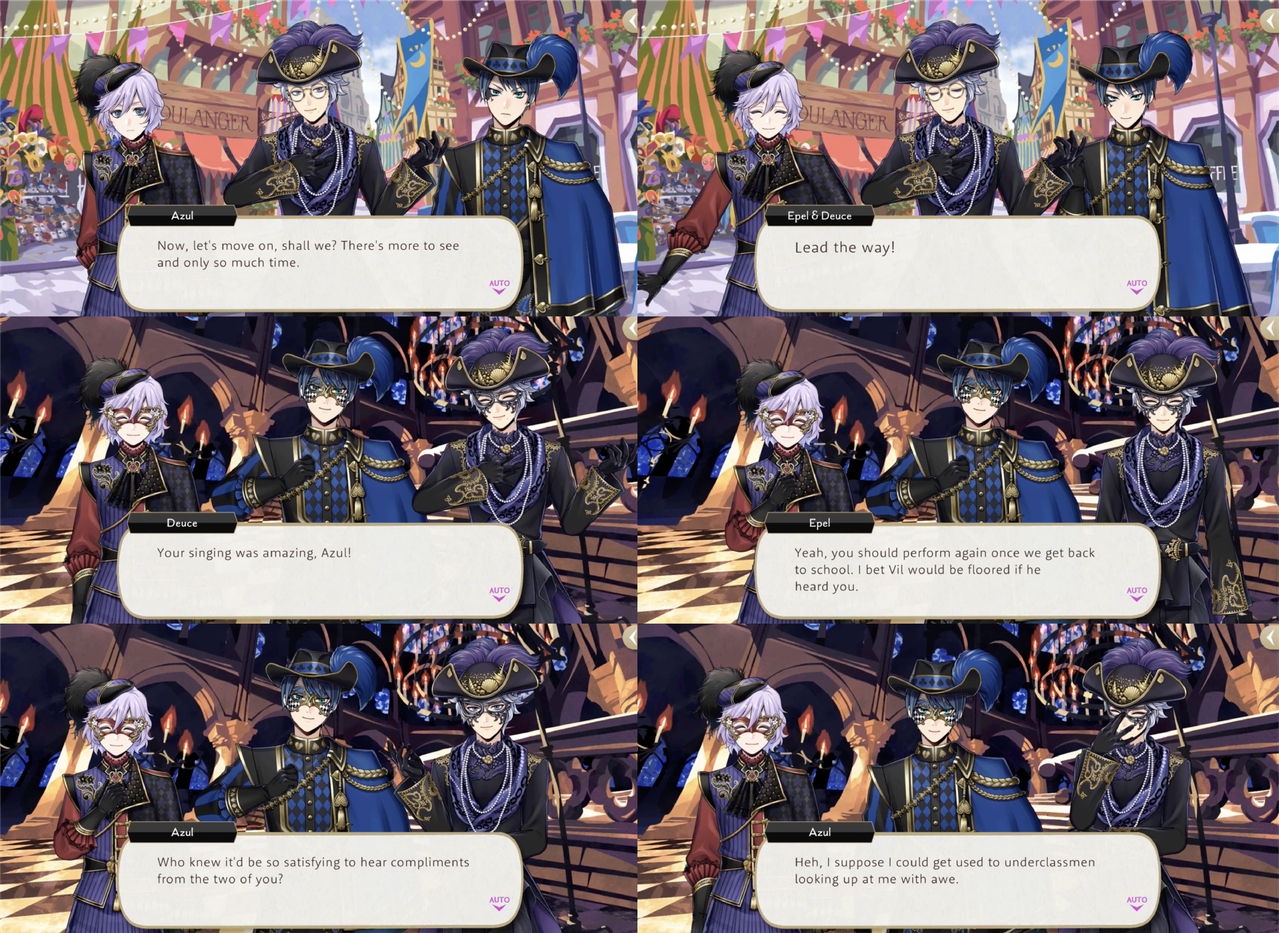 After the performance at the social Deuce and Epel compliment Azul on his singing, with Epel saying, “You should perform again once we get back to school. I bet Vil would be floored if he heard you.”