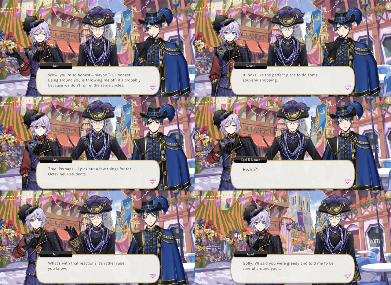 Epel is surprised when Azul shares his intent to purchase gifts for students of Octavinelle, saying, “Vil said you were greedy and told me to be careful around you, but you’re a caring housewarden!”