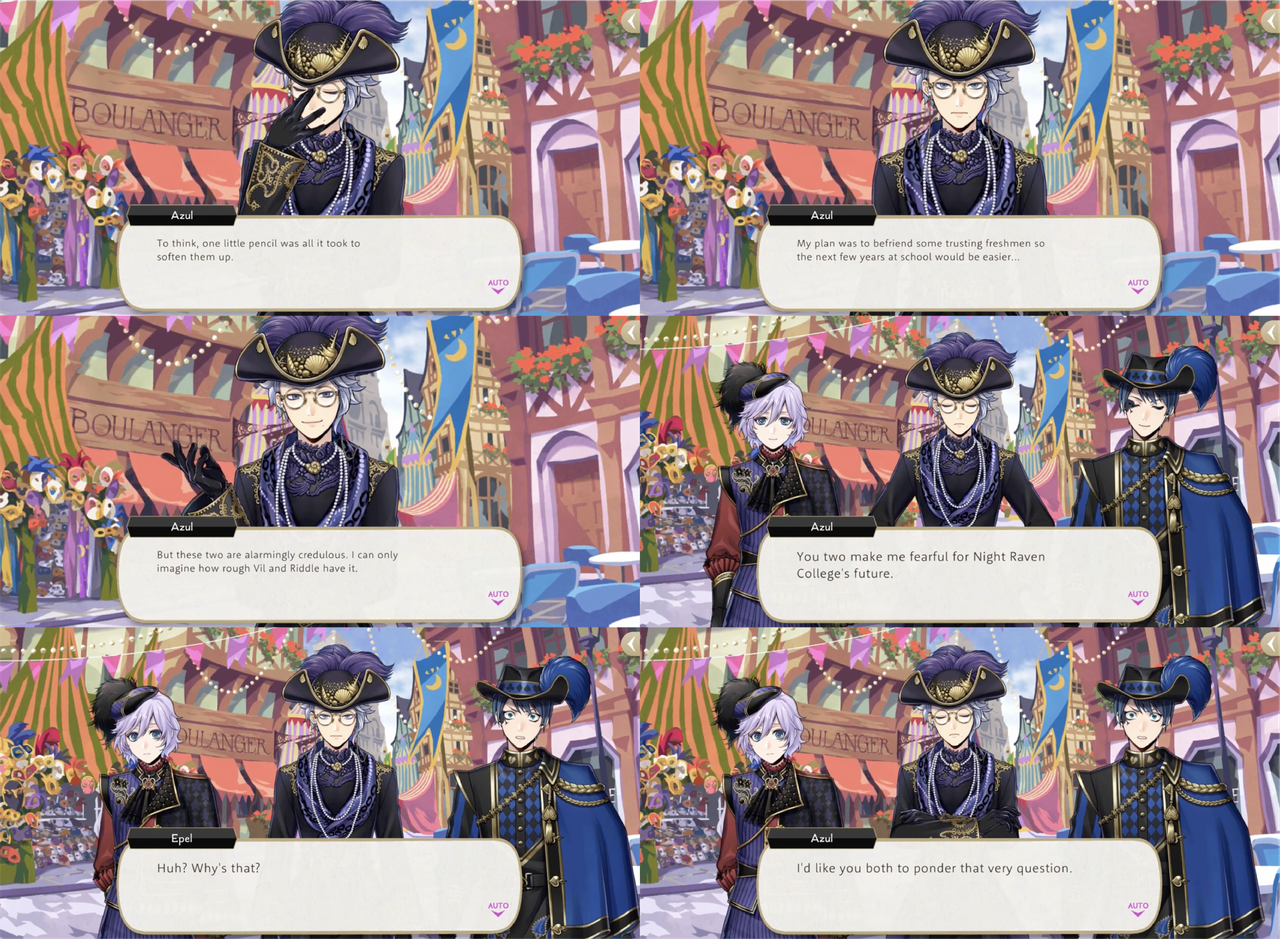 Azul reflects, “To think, one little pencil was all it took to soften them up. My plan was to befriend some trusting freshmen so the next few years at school would be easier…but these two are alarmingly credulous. I can only imagine how rough Vil and Riddle have it.” He tells them both, “You two make me fearful for Night Raven College’s future,” and asks them to ponder on why.
