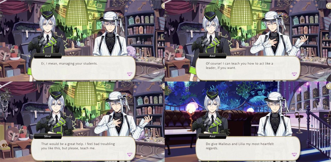After hearing of Silver’s struggles with being seen as a leader at Diasomnia Azul offers to teach him how to better “manage” his students. After his lesson Azul tells Silver, “Do give Malleus and Lilia my most heartfelt regards,” but it is maybe unconfirmed if his message was ever received.