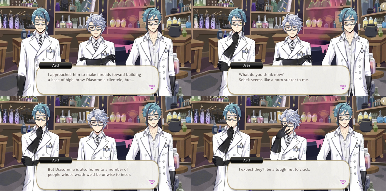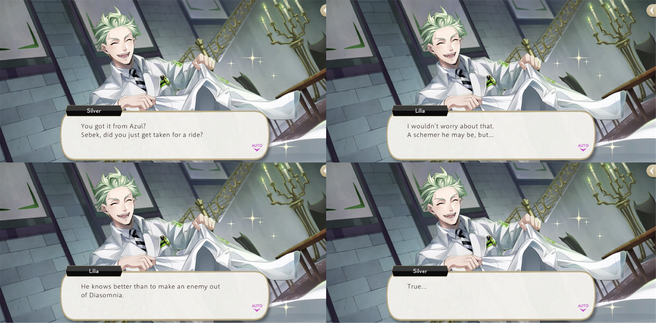 After Sebek returns to Diasomnia with Malleus’ labcoat, freshly cleaned with special detergent purchased from Azul, Lilia says that he is not worried about Azul taking advantage of him: “A schemer he may be, but he knows better than to make an enemy out of Diasomnia.”