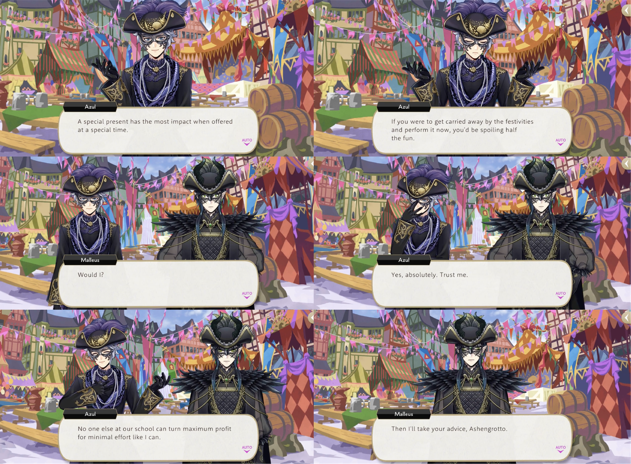 When Malleus considers revealing their performance—planned for the social—during the festival in Fleur City Azul stops him, successfully convincing Malleus to hold back. (“I will take your advice, Ashengrotto.”)