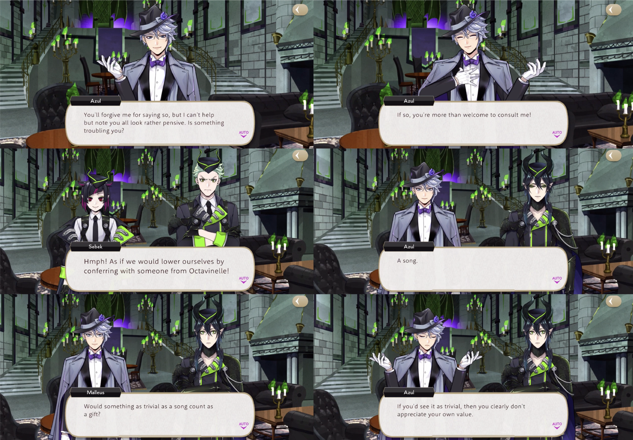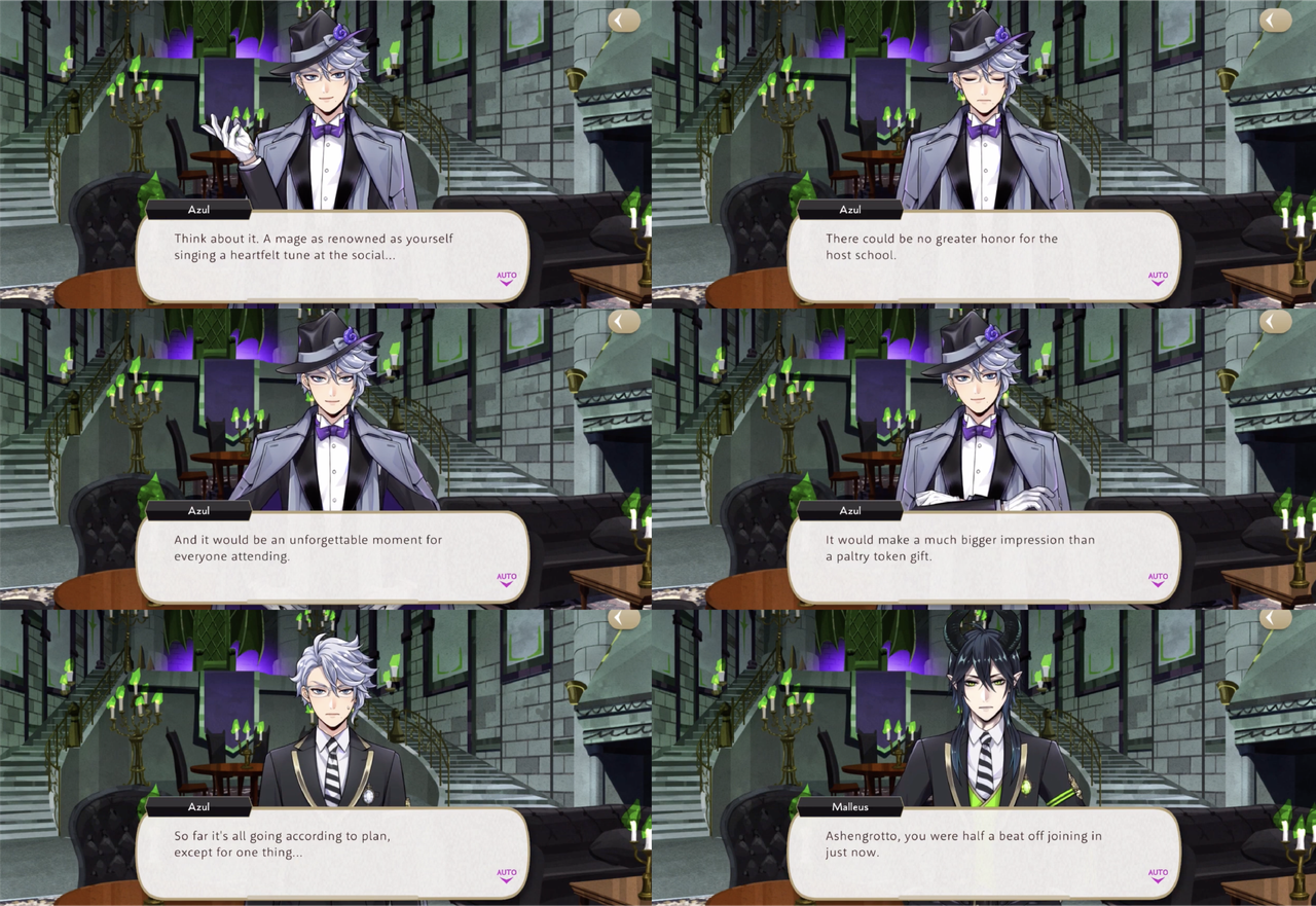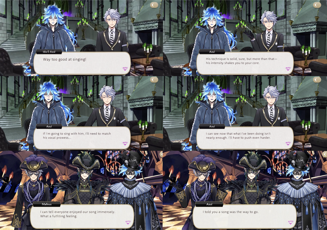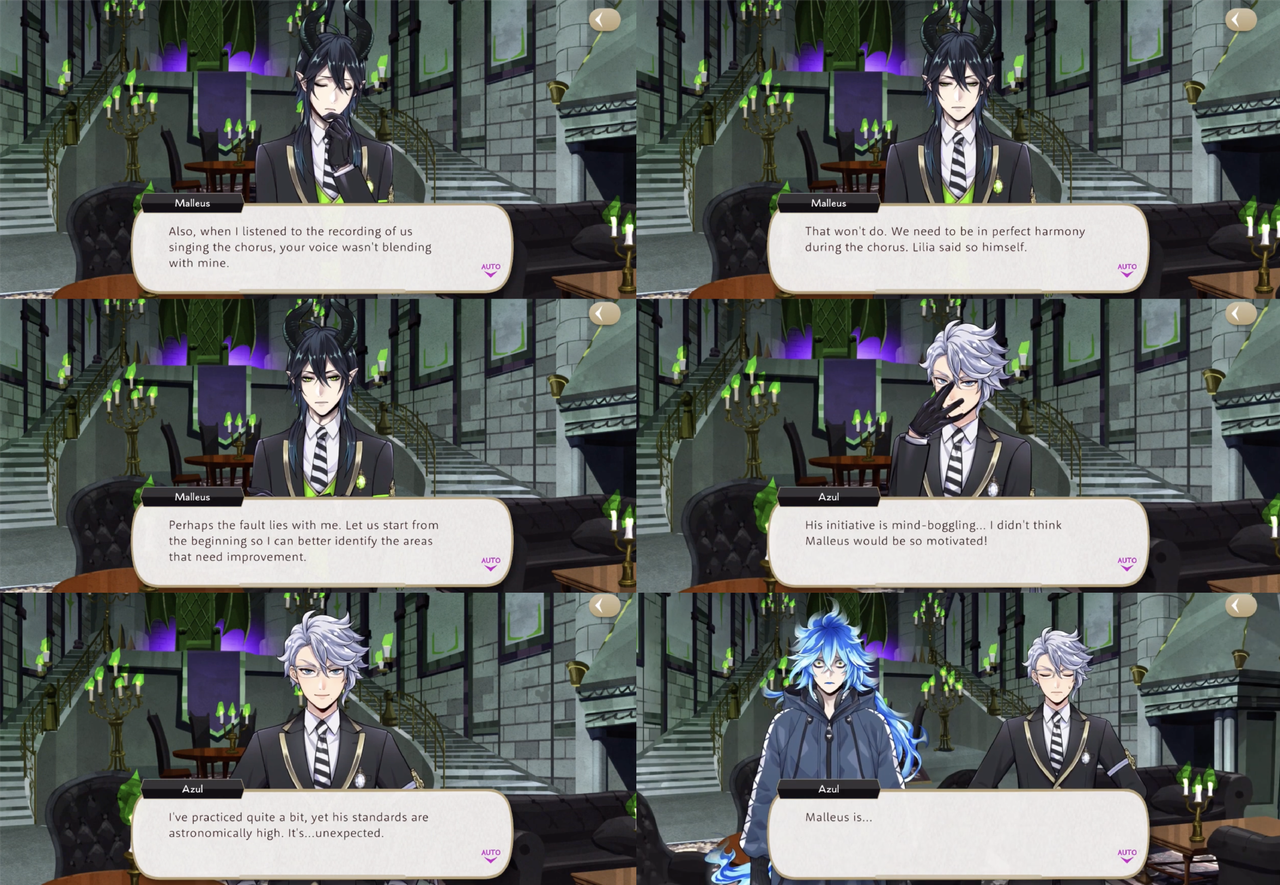 Malleus proves to be strict during practices (“Ashengrotto, you were half a beat off joining in just now. Also, when I listened to the recording of us singing the chorus, your voice wasn’t blending with mine”), impressing Azul, who says, “His initiative is mind-boggling… I didn’t think Malleus would be so motivated!” Azul reacts to the revelation of Malleus’ high standards (and impressive singing talent) by deciding to “push even harder” in order to match his vocal prowess.