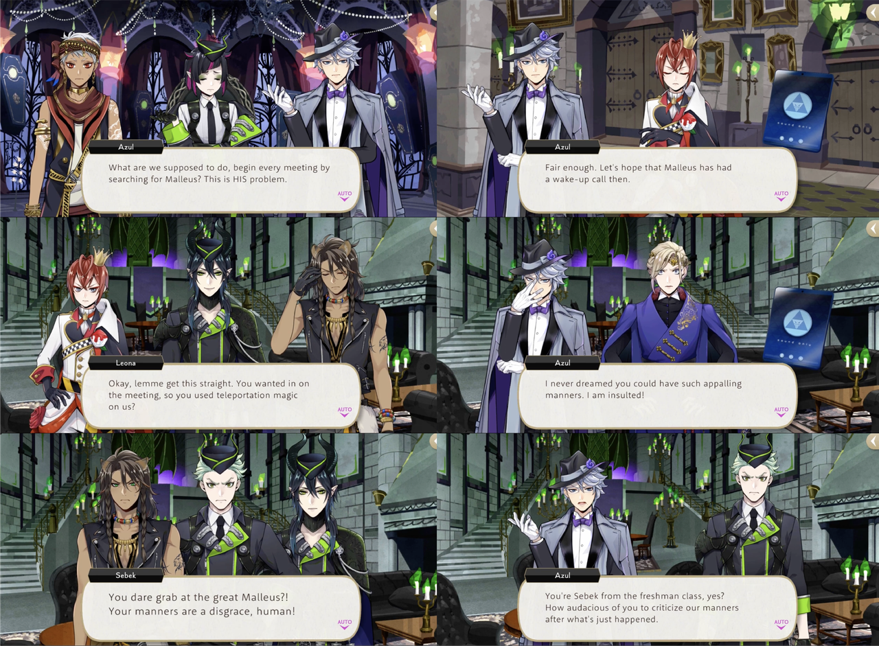 Much like the other hosuewardens Azul is displeased when Malleus tries to solve his attendance problem by unilaterally decided to bring the meeting to Diasomnia without anyone’s consent, saying to Malleus’ face, “I never dreamed you could have such appalling manners. I am insulted!,” and scolding Sebek for daring to criticize them after what happened.