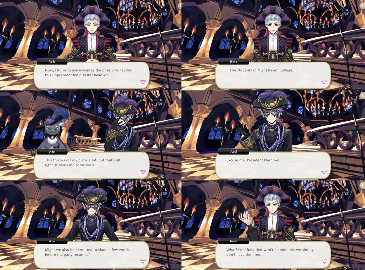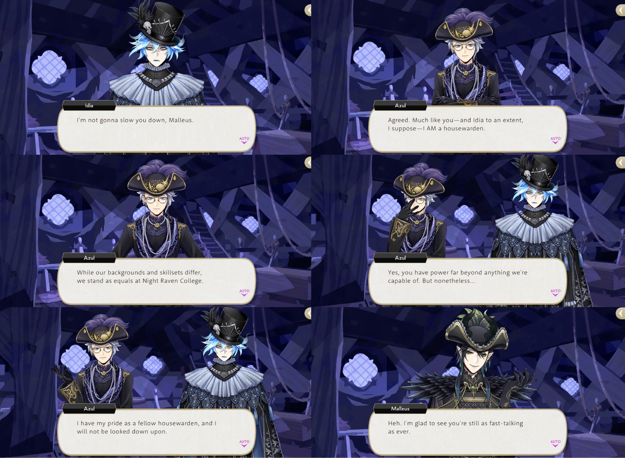 While on their way to confront Rollo, Malleus emphasizes the importance of their mission to Azul and Idia, telling them, “You must press onward, even if you have to grit your teeth so hard they break,” and Azul responds, “While our backgrounds and skillsets differ, we stand as equals at Night Raven College. Yes, you have power far beyond anything we’re capable of. But nonetheless, I have my pride as a fellow housewarden, and I will not be looked down upon.” Malleus says that he is glad to see that Azul is “still as fast-talking as ever.”