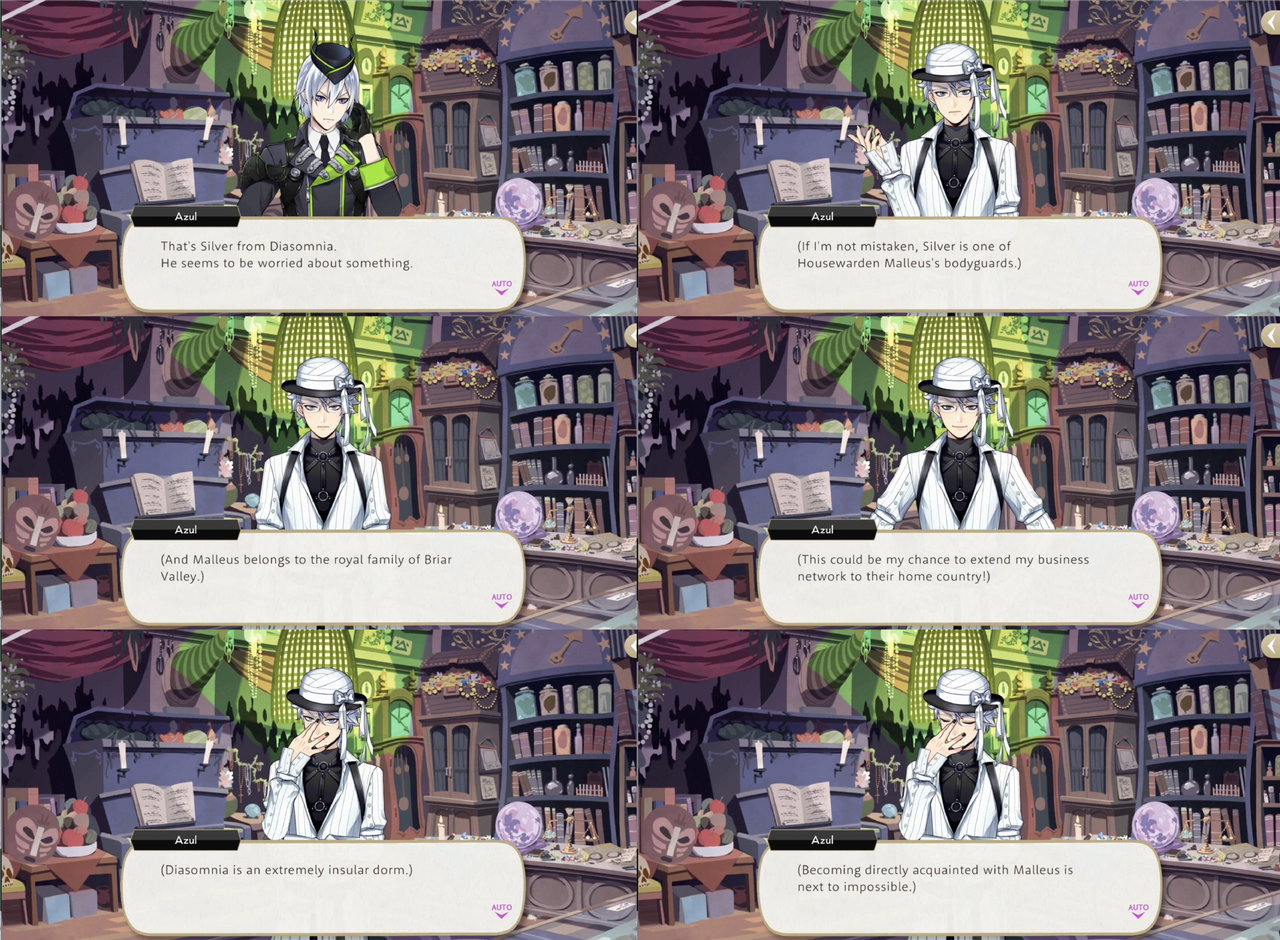 Upon seeing a troubled Silver in the school store, Azul’s first thought is to take advantage of the opportunity to gain access to Malleus: “Silver is one of Housewarden Malleus’s bodyguards…Becoming directly acquainted with Malleus is next to impossible. Which is why I must first make his underlings indebted to me, to help pave the way.”