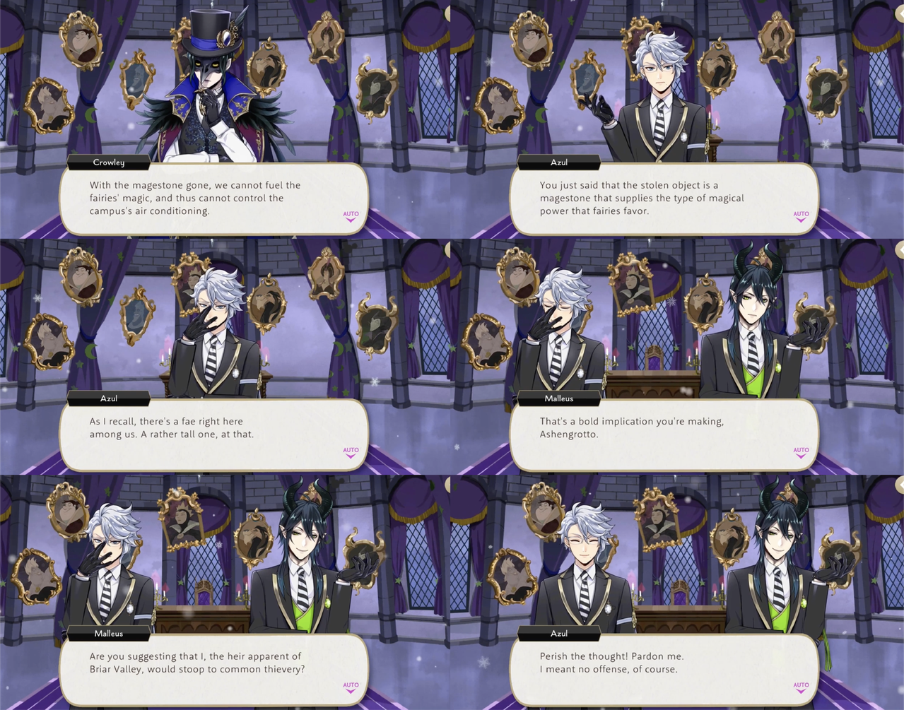 Much like the rest of the housewardens, Azul seems unafraid of Malleus: when an important magestone disappears during Fairy Gala Azul seems to suggest that it was taken by Malleus, but when Malleus asks, “Are you suggesting that I, the heir apparent of Briar Valley, would stoop to common thievery?,” he denies it.