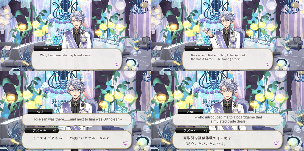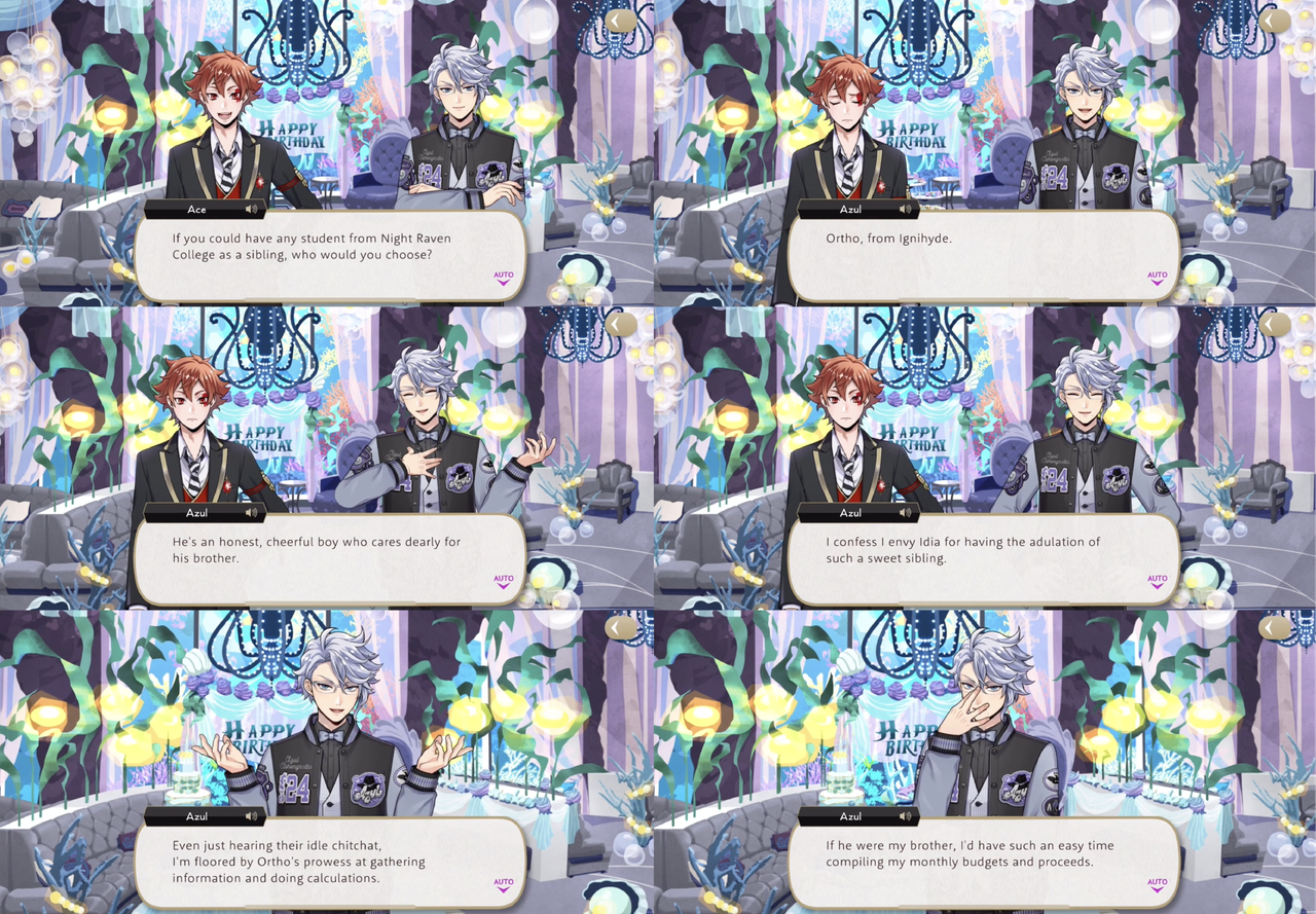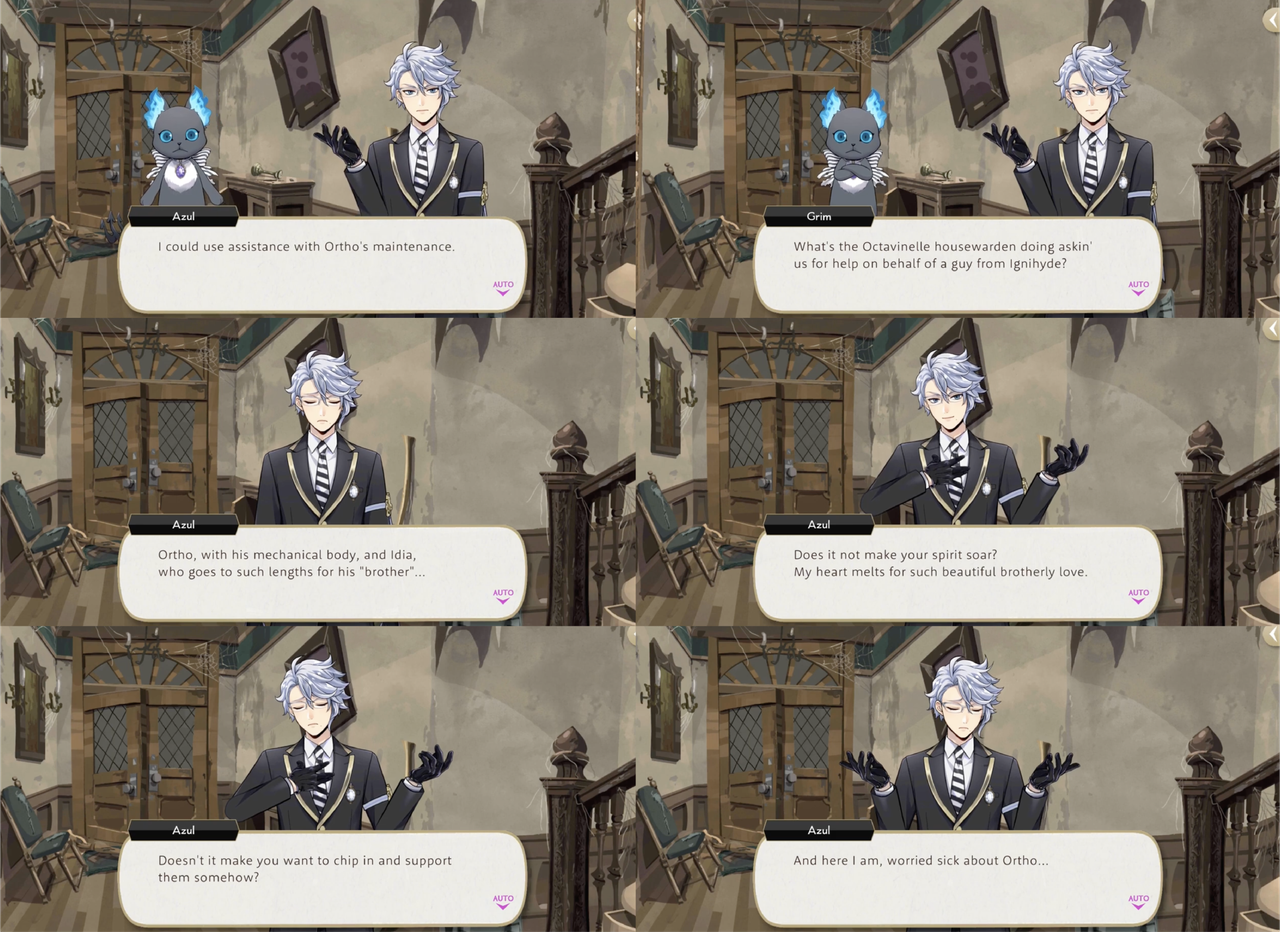 In a vignette Azul goes to Grim for help with maintenance on a set of Ortho’s gear, and when Grim asks “What’s the Octavinelle housewarden doing askin’ us for help on behalf of a guy from Ignihyde?,” he responds, “Ortho, with his mechanical body, and Idia, who goes to such lengths for his “brother,” Does it not make your spirit soar? My heart melts for such beautiful brotherly love.”