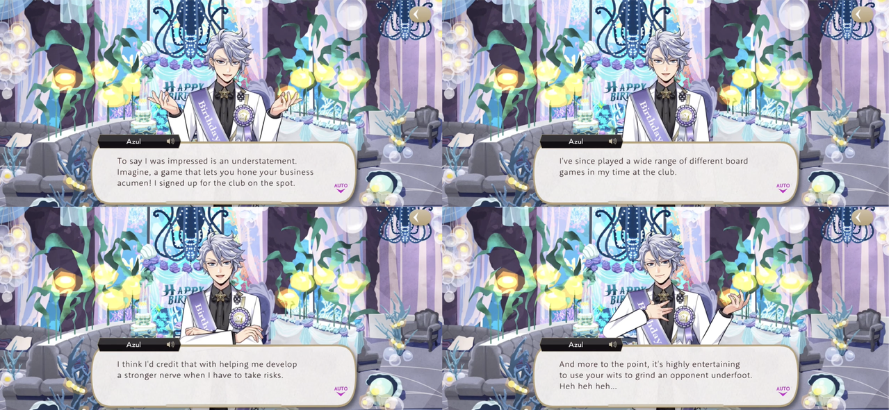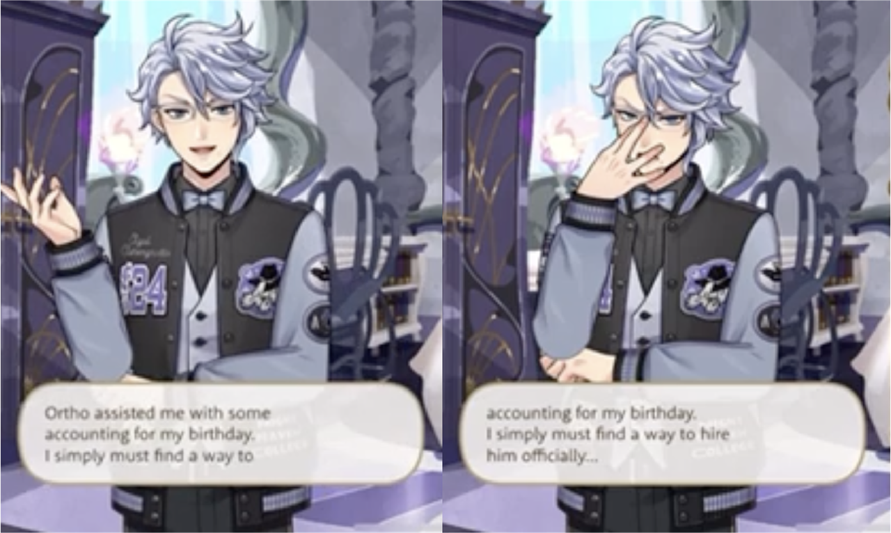 In a voice line Azul says, “Ortho assisted me with some accounting for my birthday. I simply must find a way to hire him officially…”