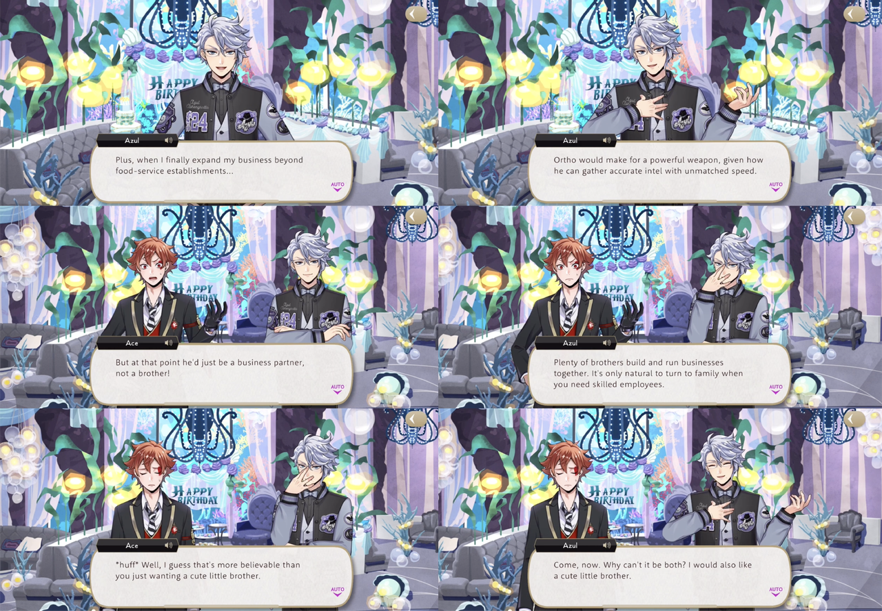 Ace says, “I guess that’s more believable than you just wanting a cute little brother” and Azul replies, “Why can’t it be both? I would also like a cute little brother.”