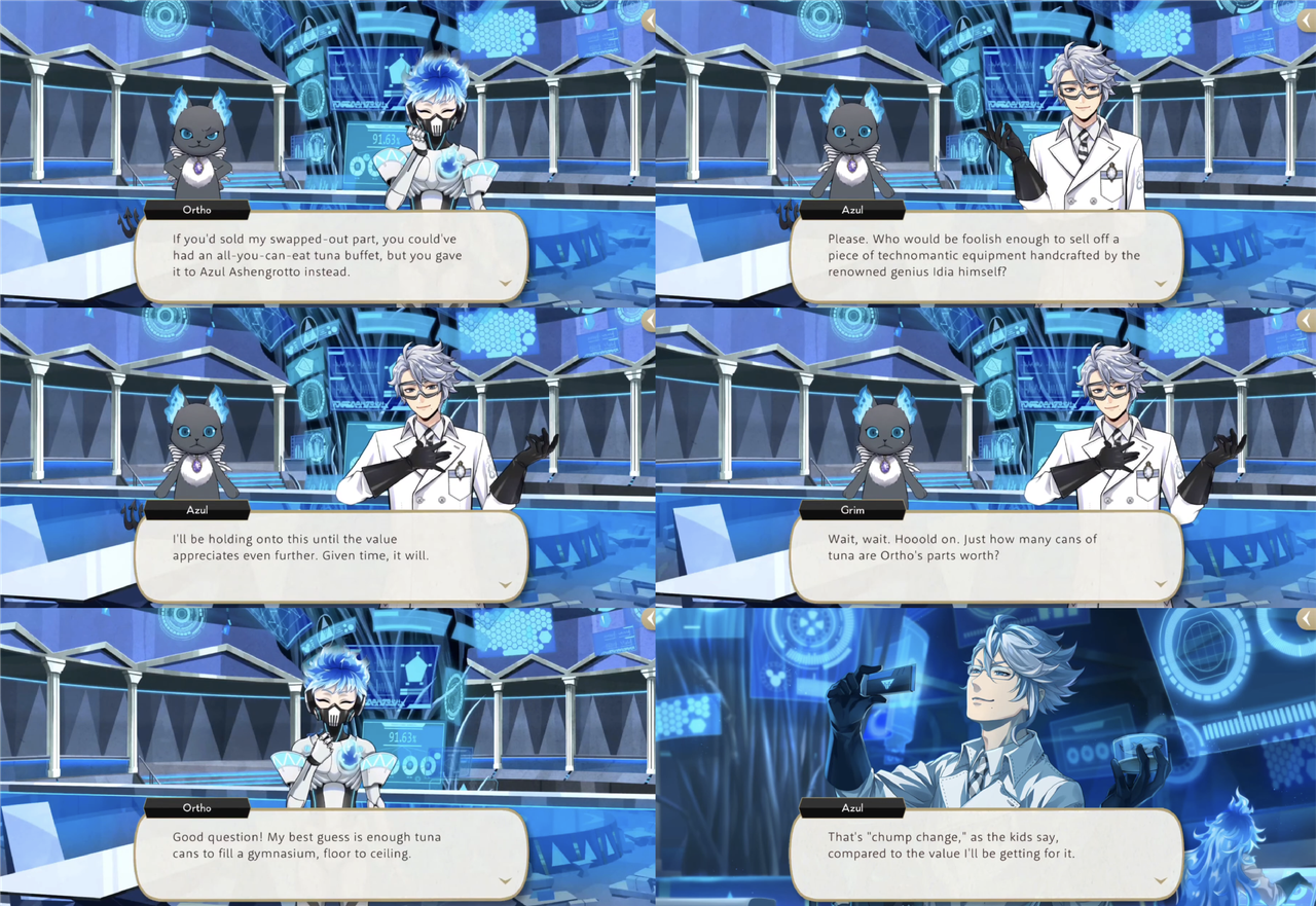 Azul claims to be “worried sick about Ortho,” but at the end of the vignette it is revealed that he seems to have had an ulterior motive: he receives the part that Grim removes from Ortho’s gear, worth enough to purchase “enough tuna cans to fill a gymnasium,” though Azul says that is “chump change” compared to the value he will be getting for it.