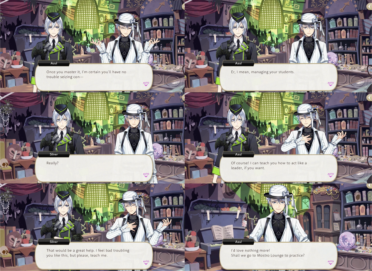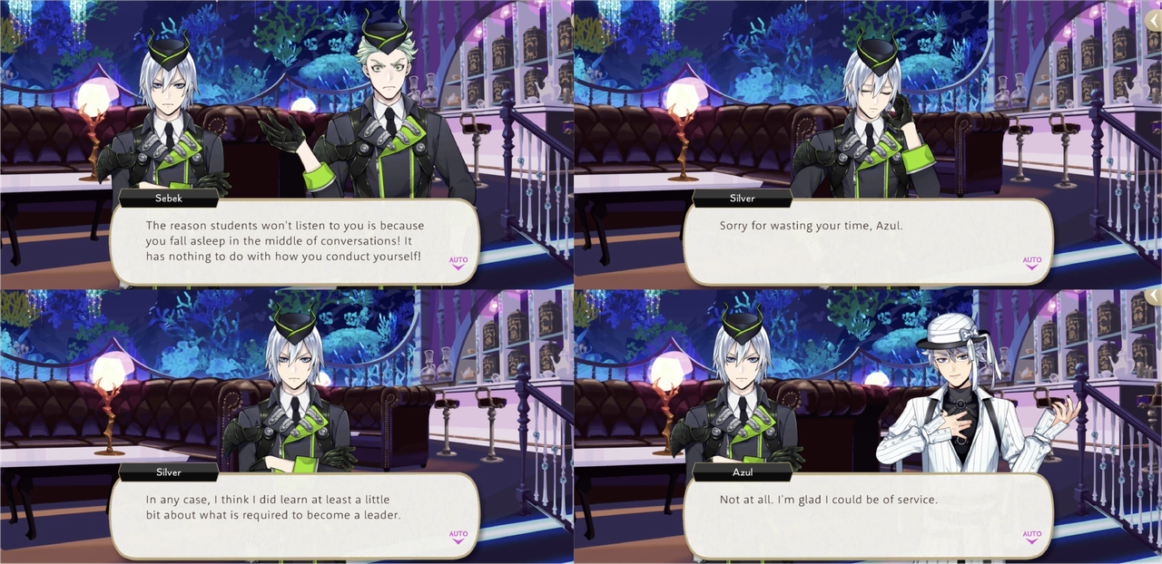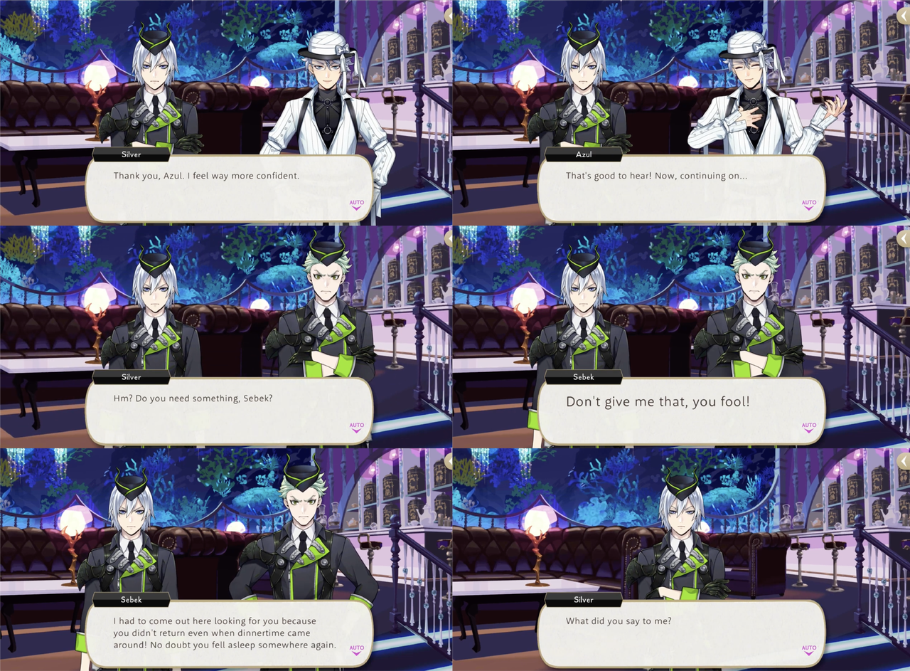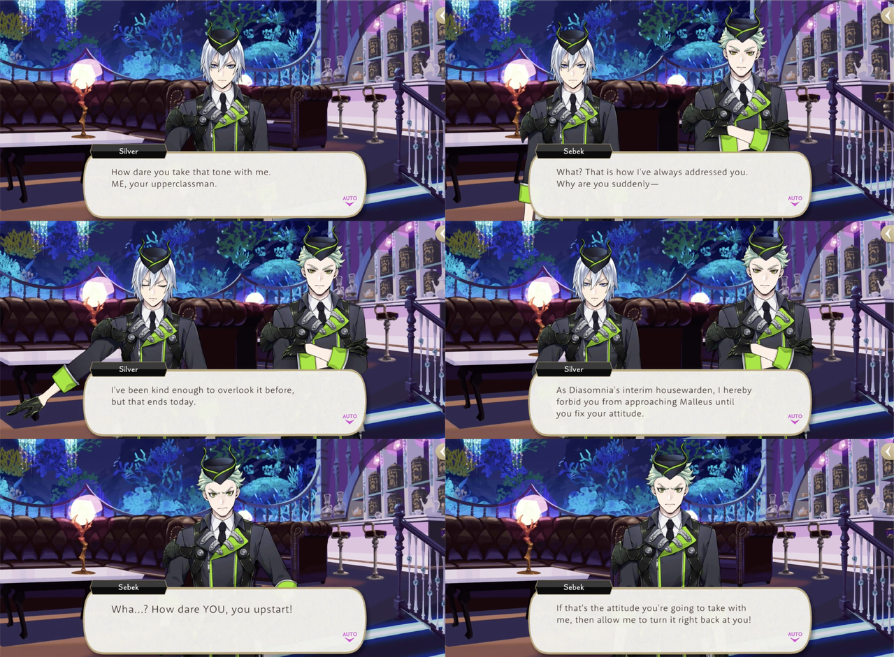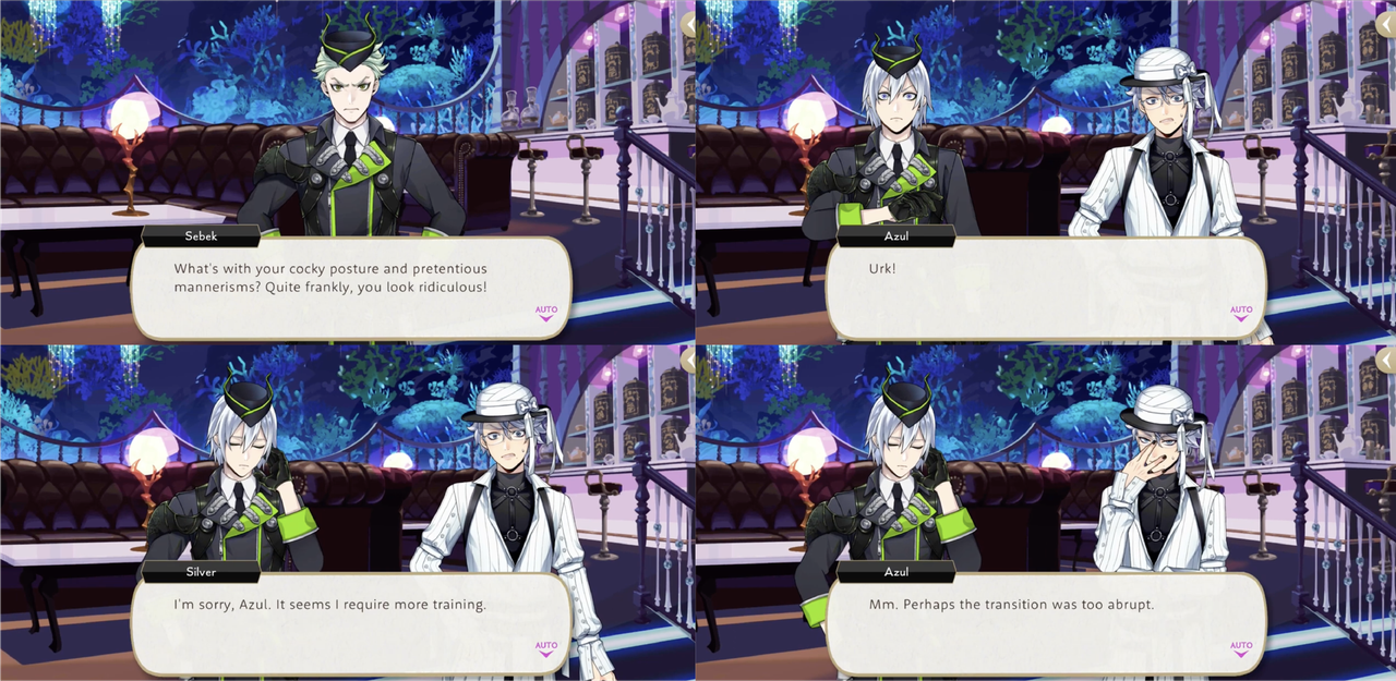 Azul takes Silver to Mostro Lounge for a three-hour lesson that ends with Silver saying he is feeling more confident, but when Silver reprimands Sebek for being rude and tries to forbid him from appearing before Malleus until he fixes his attitude Sebek turns on him with, “What’s with your cocky posture and pretentious mannerisms? Quite frankly, you look ridiculous!,” presumably in reference to the posture and mannerisms that he has just learned from Azul.