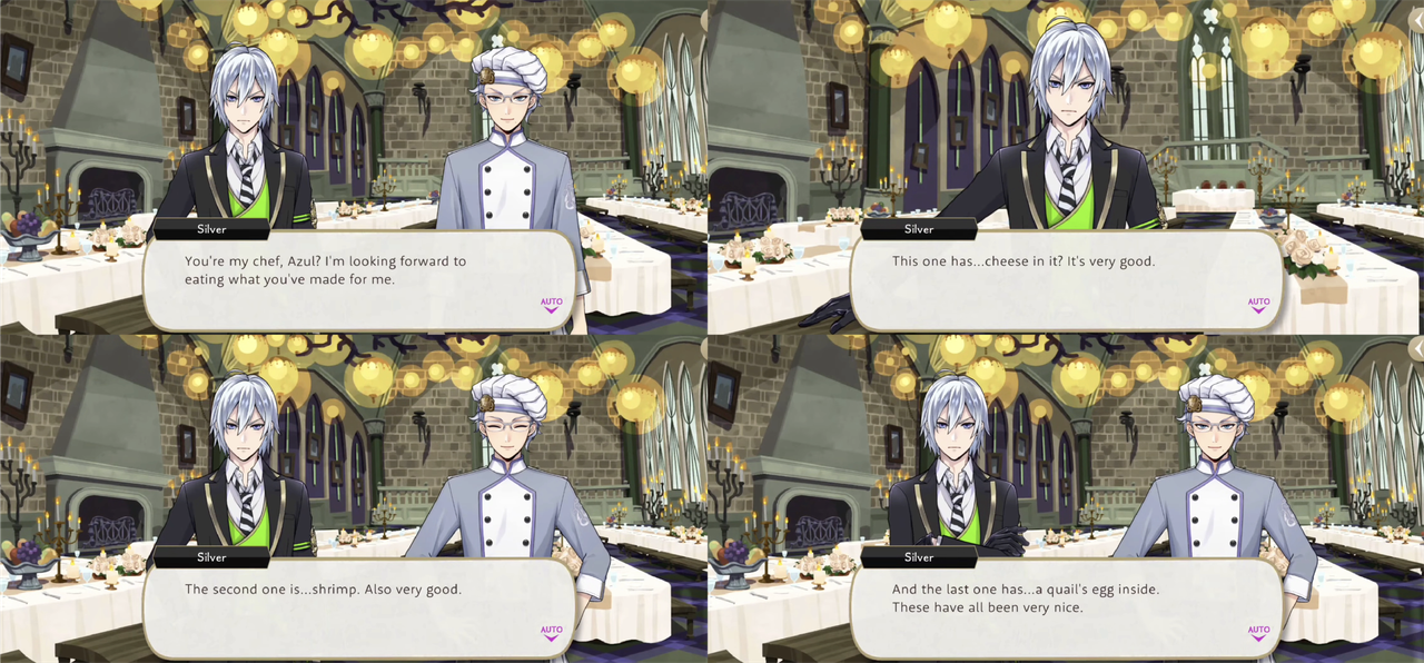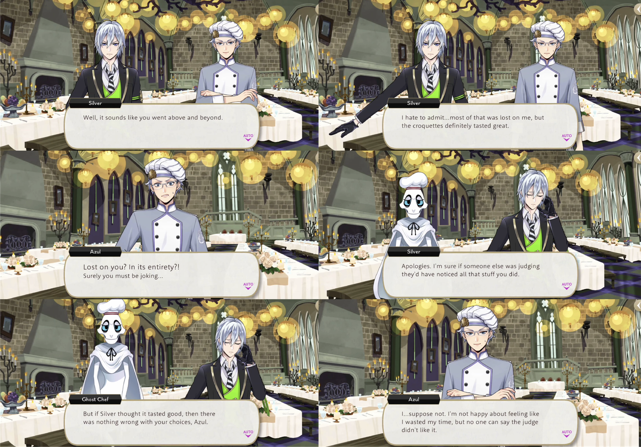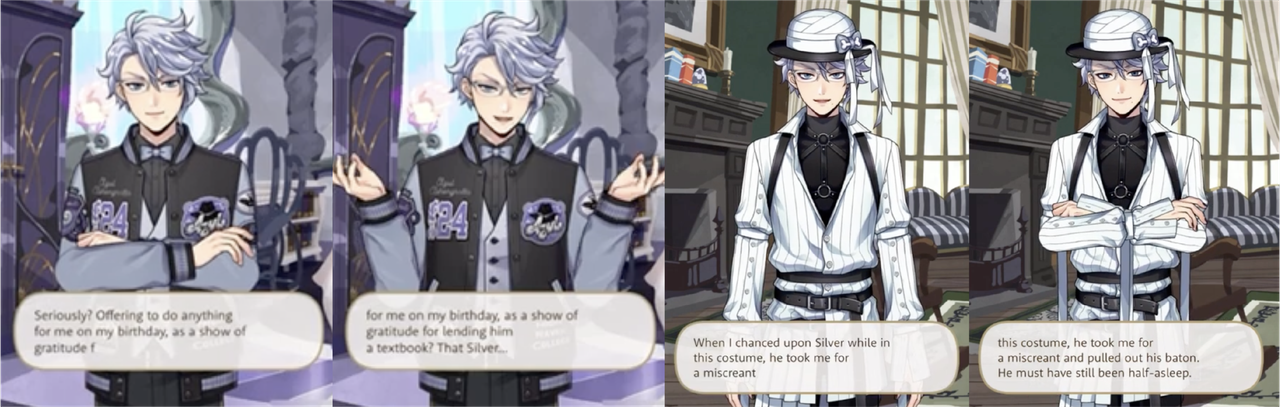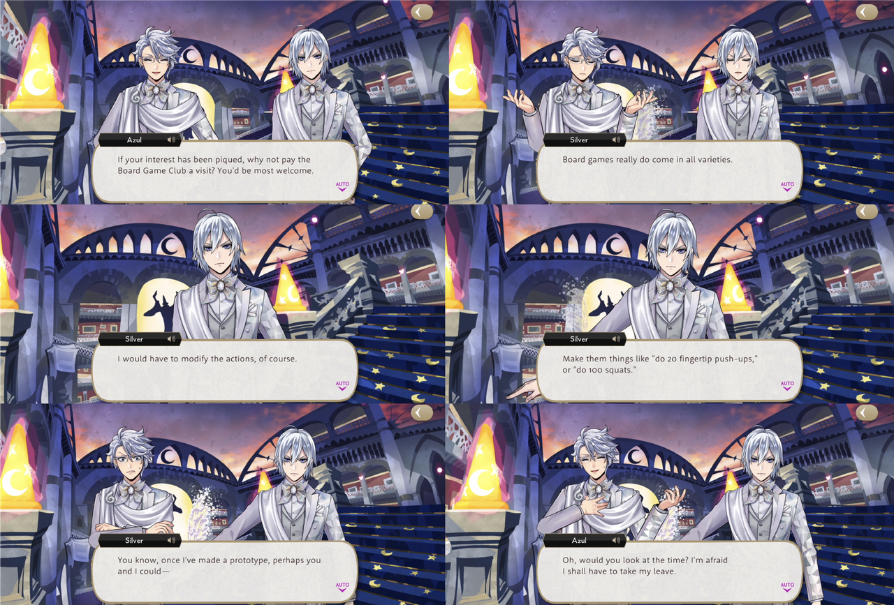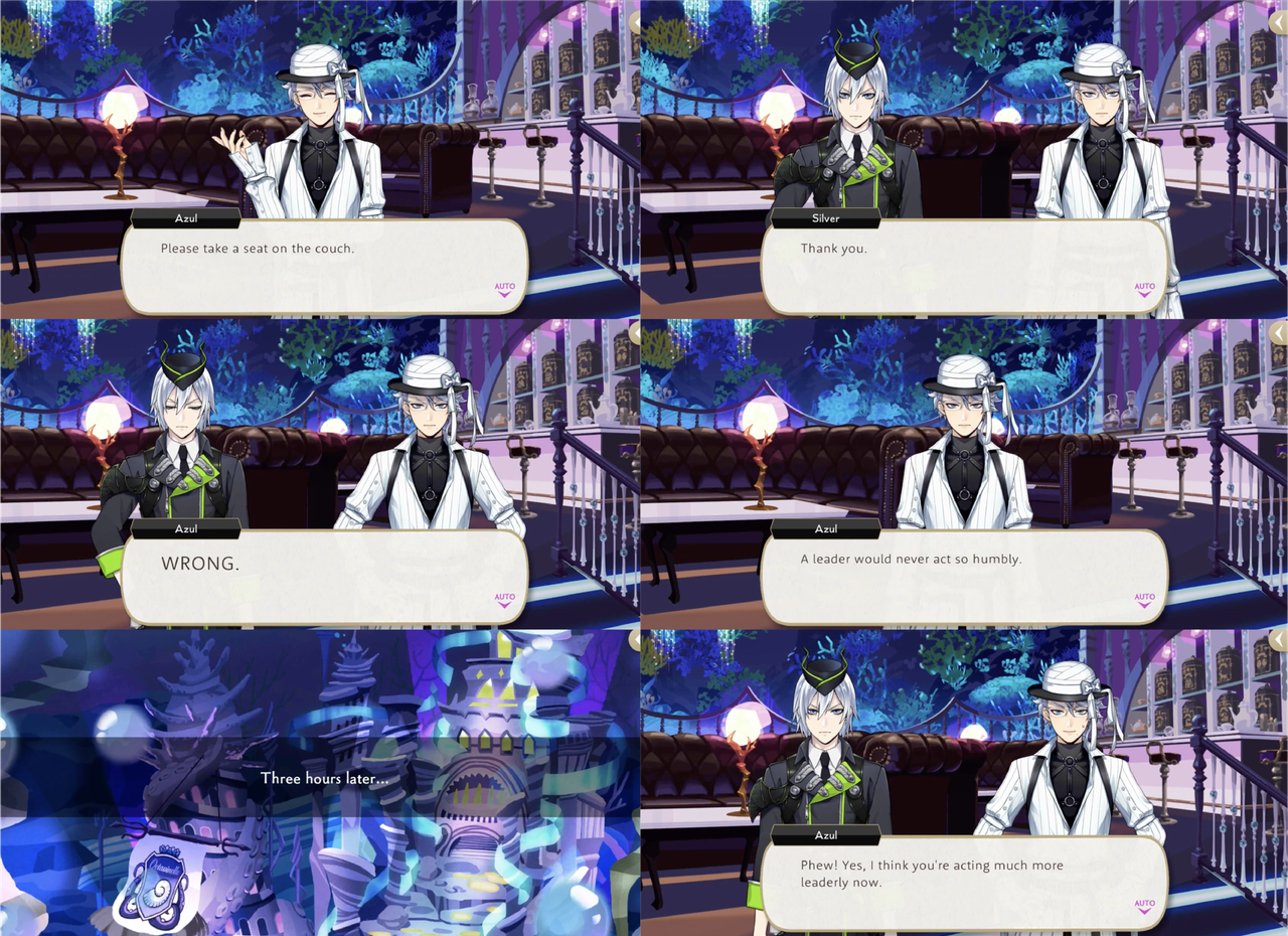 Azul takes Silver to Mostro Lounge for a three-hour lesson that ends with Silver saying he is feeling more confident, but when Silver reprimands Sebek for being rude and tries to forbid him from appearing before Malleus until he fixes his attitude Sebek turns on him with, “What’s with your cocky posture and pretentious mannerisms? Quite frankly, you look ridiculous!,” presumably in reference to the posture and mannerisms that he has just learned from Azul.