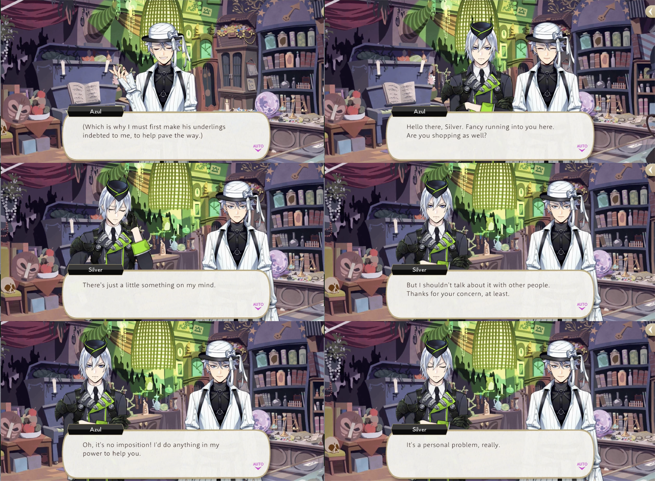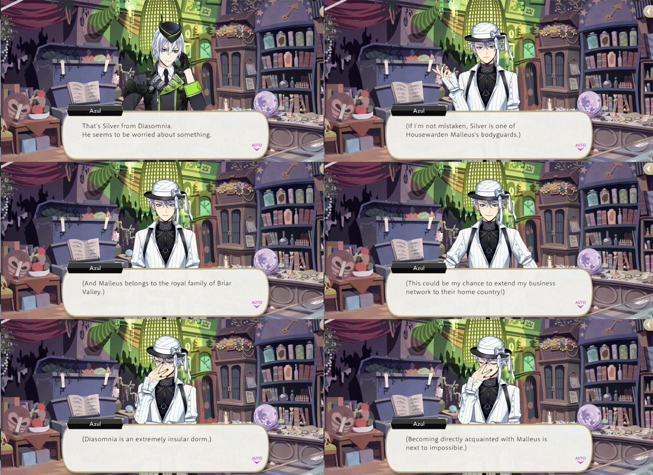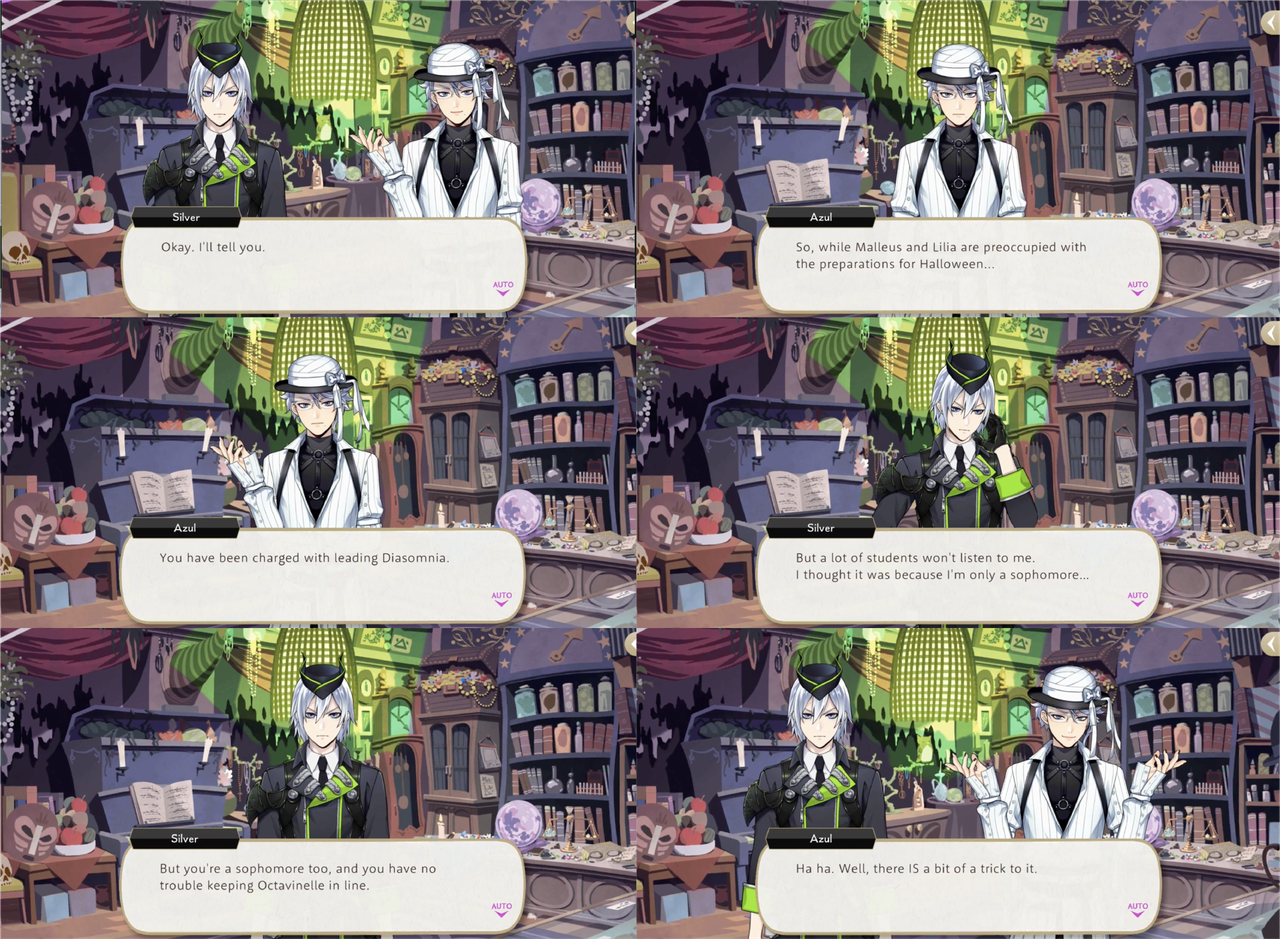 Azul’s Halloween vignette revolves around Silver: upon seeing him looking worried, Azul approaches him to offer advice with the ulterior motive of getting Malleus’ underlings indebted to him, so he might become acquainted with Malleus himself and extend his business network to Briar Valley.