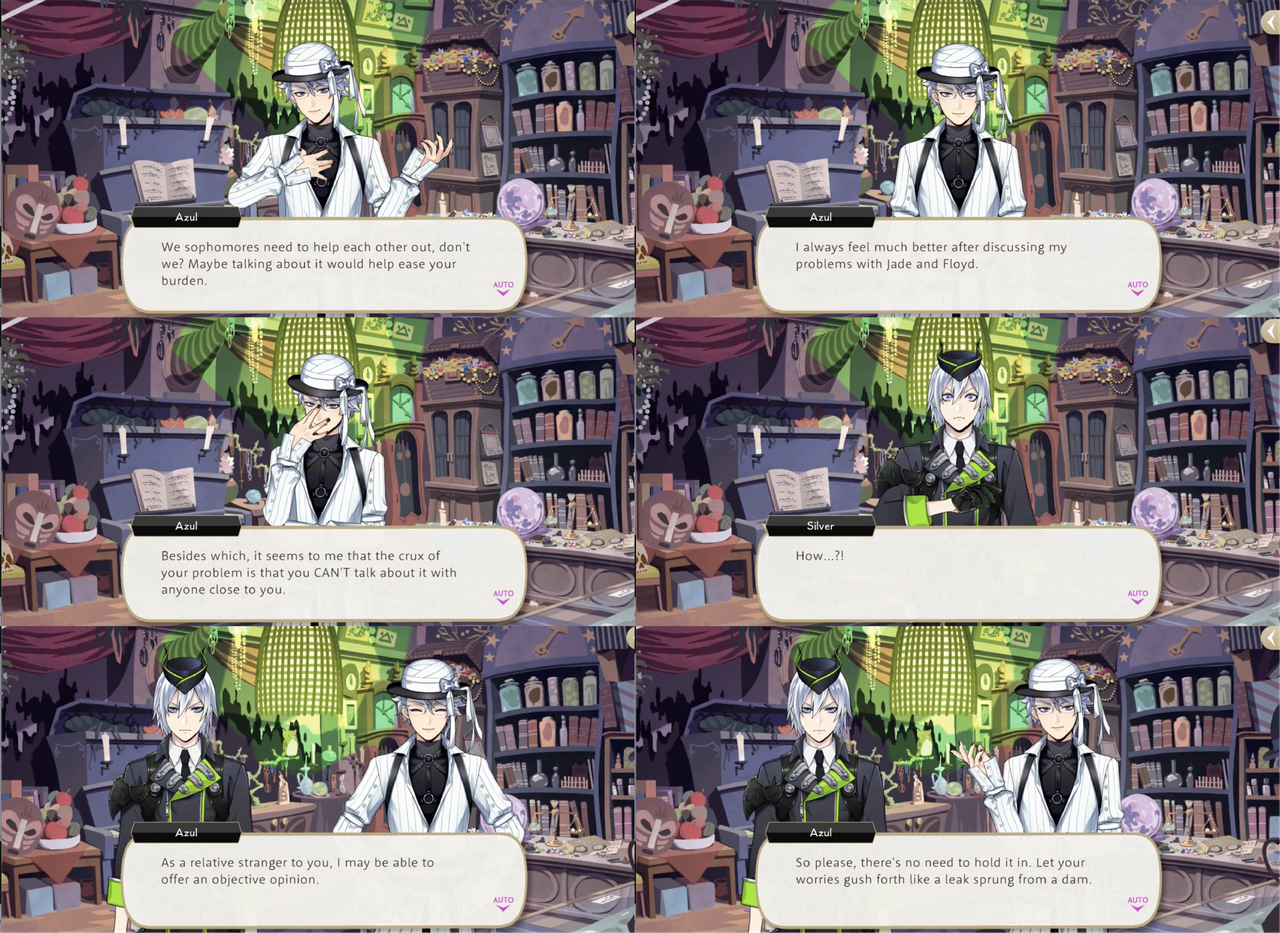 Silver initially refuses to confide in Azul but Azul assures him, “Maybe talking about it would help ease your burden. I always feel much better after discussing my problems with Jade and Floyd. Besides which, it seems to me that the crux of your problem is that you CAN’T talk about it with anyone close to you,” which resonates with Silver.