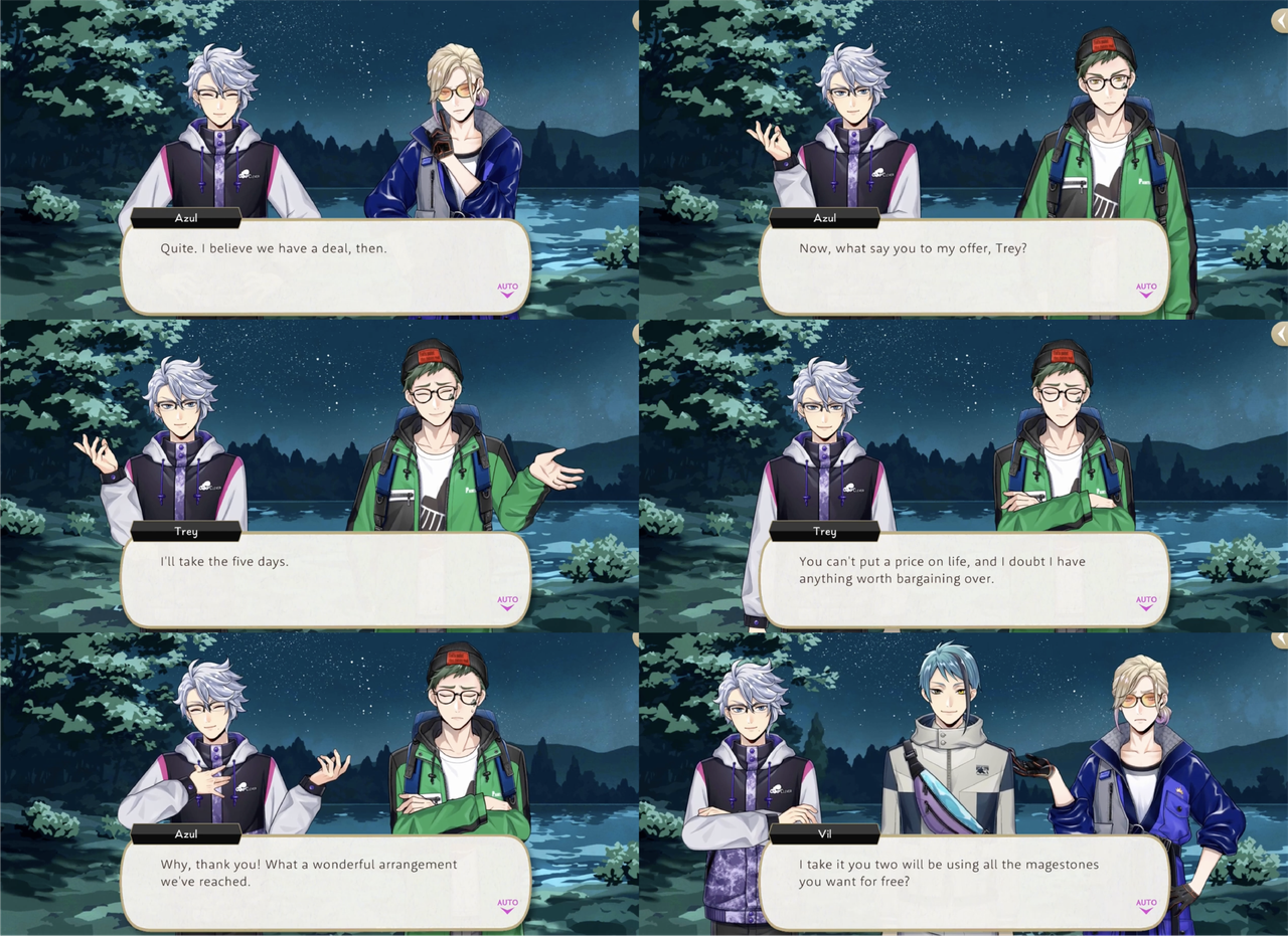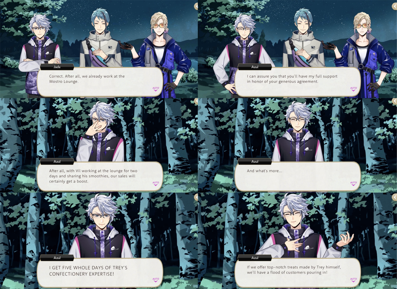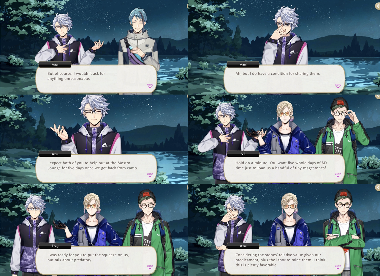 Azul’s condition for sharing his magestones rather than spending the rest of the night as a mermaid in the lake with Jade is five days of labor from both Vil and Trey at Mostro Lounge (Trey: “I was ready for you to put the squeeze on us, but talk about predatory…”).