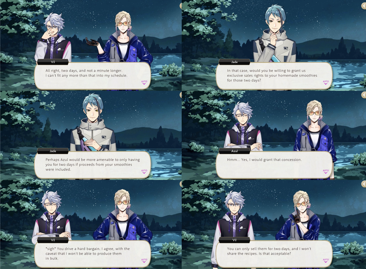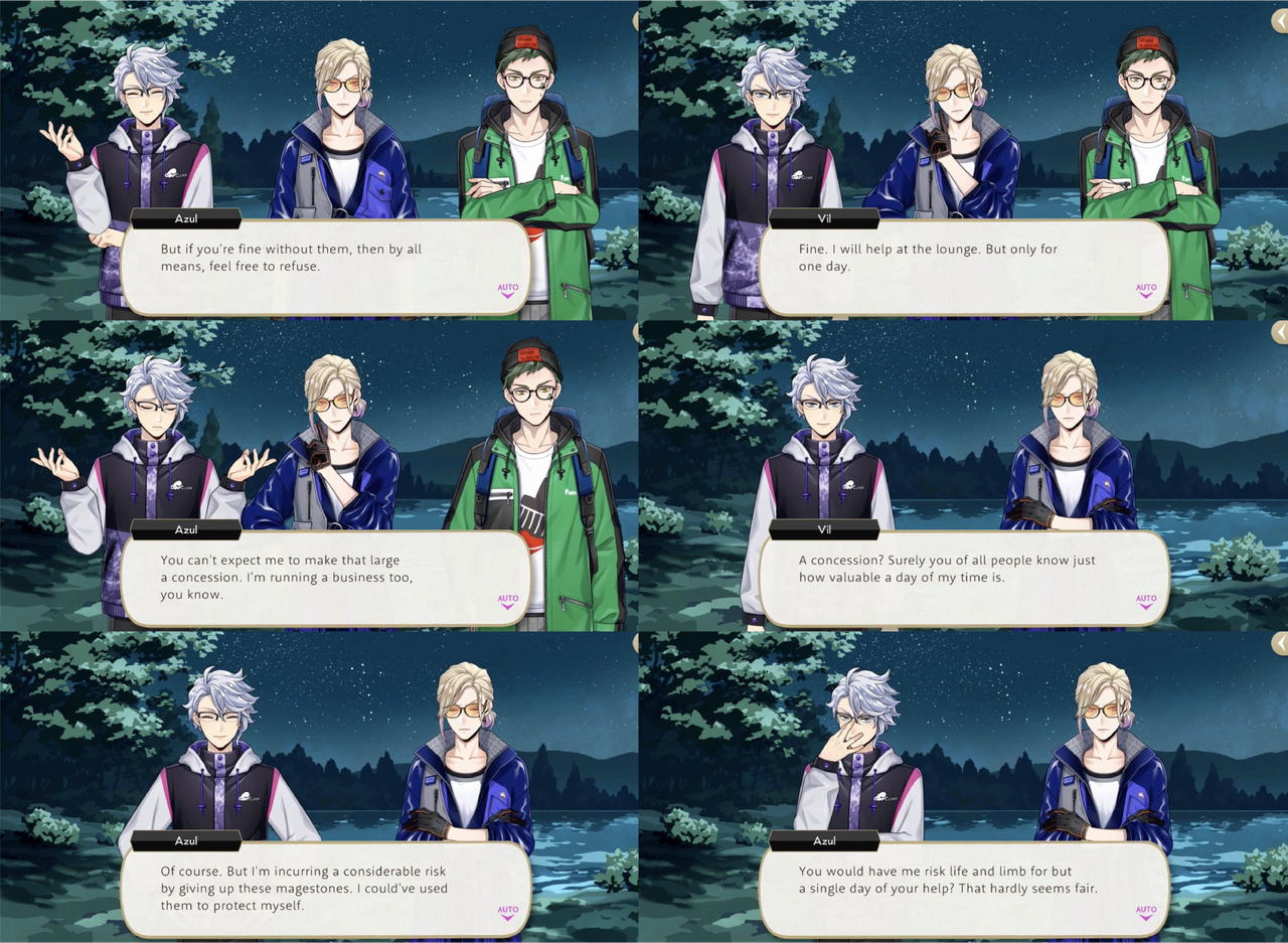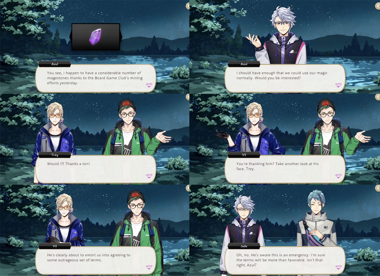 Azul’s condition for sharing his magestones rather than spending the rest of the night as a mermaid in the lake with Jade is five days of labor from both Vil and Trey at Mostro Lounge (Trey: “I was ready for you to put the squeeze on us, but talk about predatory…”).