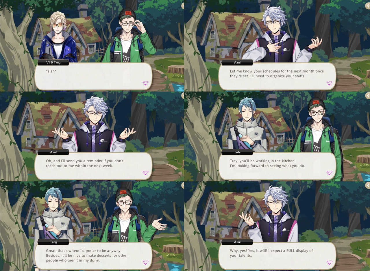 At the end of the event Azul is certain to remind both Trey and Vil of their agreements, and Jade informs Trey that he will be working in the kitchen (Trey: “Great, that’s where l’d prefer to be anyway”). Azul follows with, “Why, yes! Yes, it will! I expect a FULL display of your talents.”