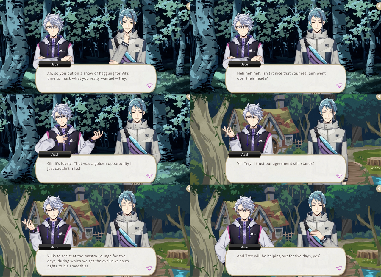 While Azul seems pleased with the projected boost in sales that the lounge will be experiencing thanks to Vil’s smoothies, it is later revealed that his haggling with Vil was a misdirect, and his actual target was Trey: “If we offer top-notch treats made by Trey himself, we’ll have a flood of customers pouring in!”