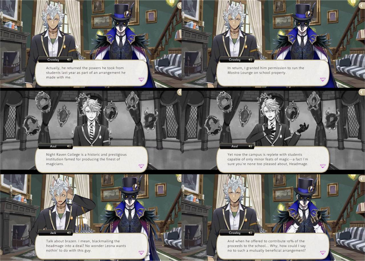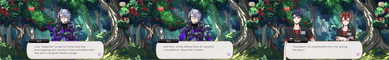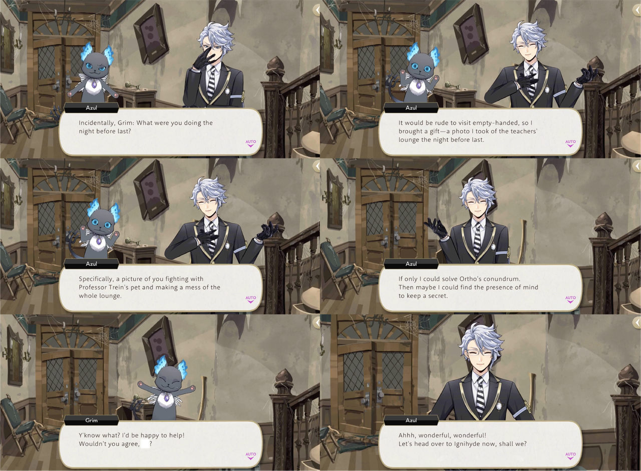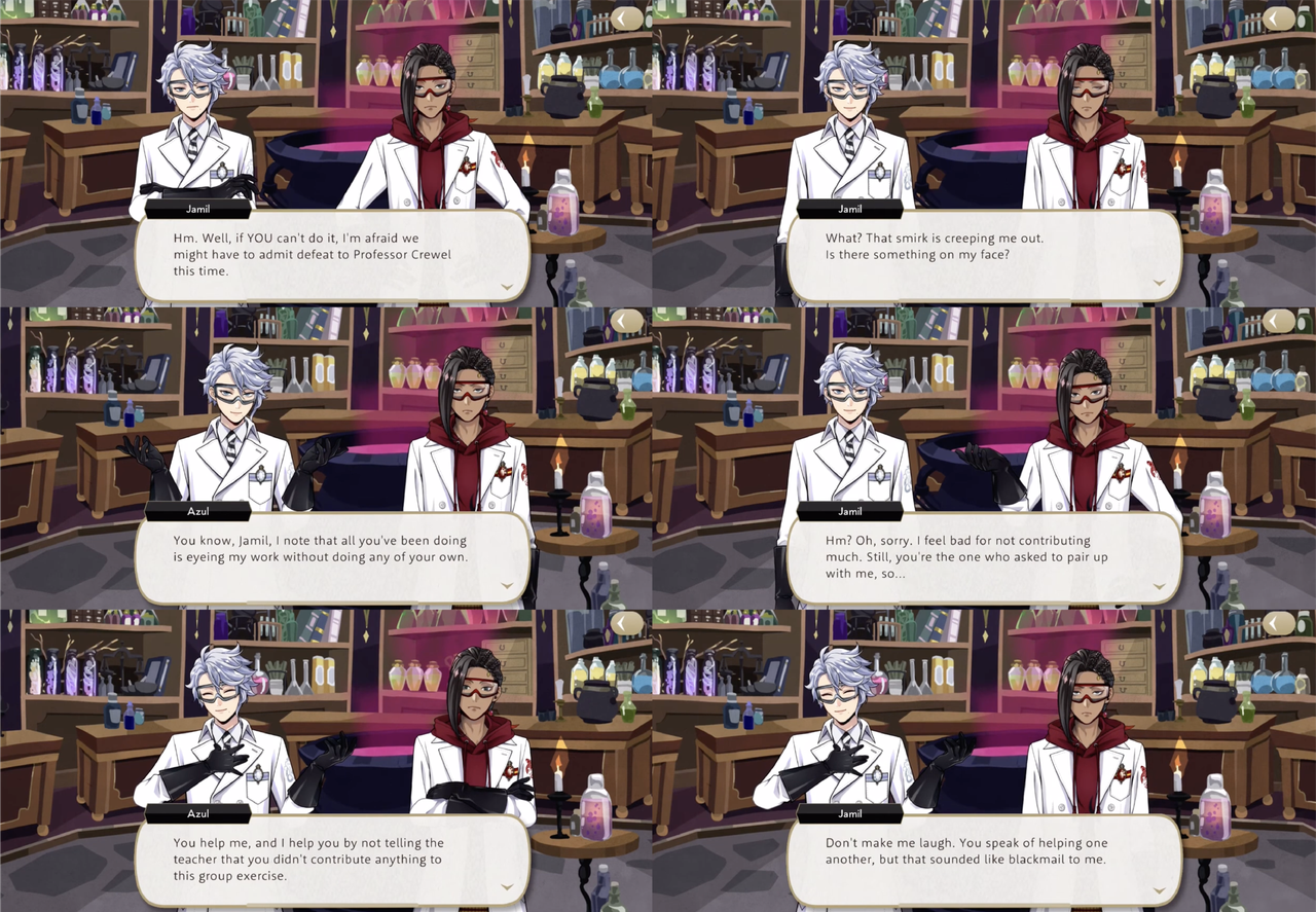 Azul blackmails a reluctant Jamil into cooperating with him during a class project by threatening to reveal that Jamil had not contributed anything to their group assignment, and Grim into helping with a task with the threat of showing Trein a picture of Grim fighting with Lucius.
