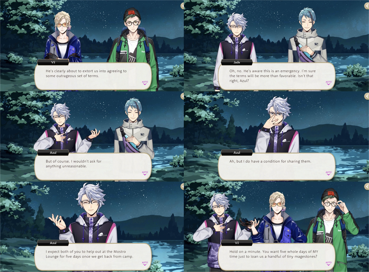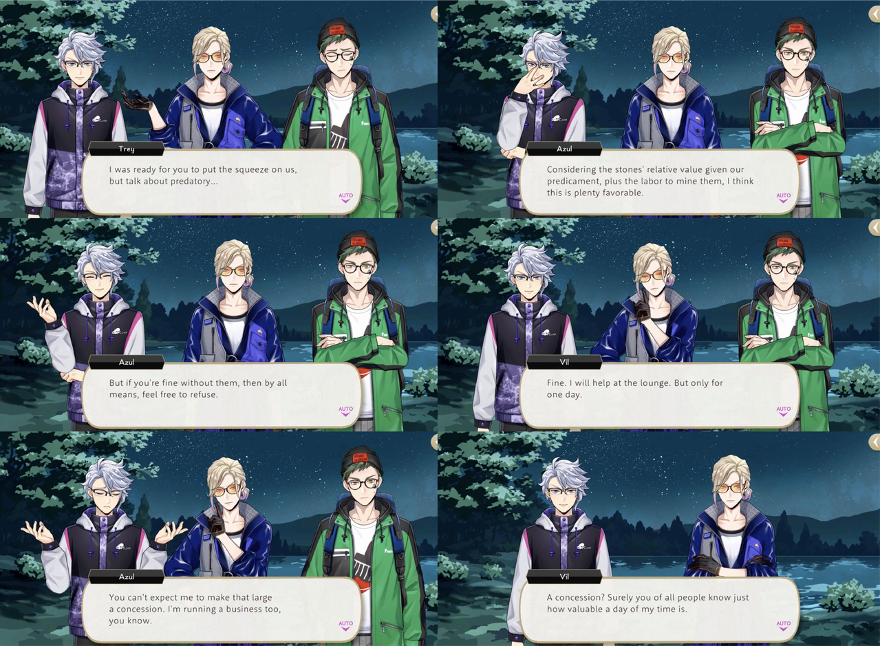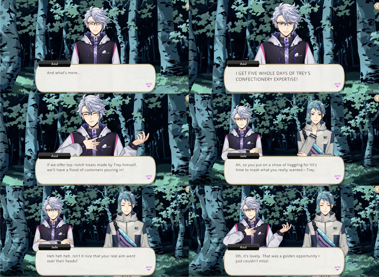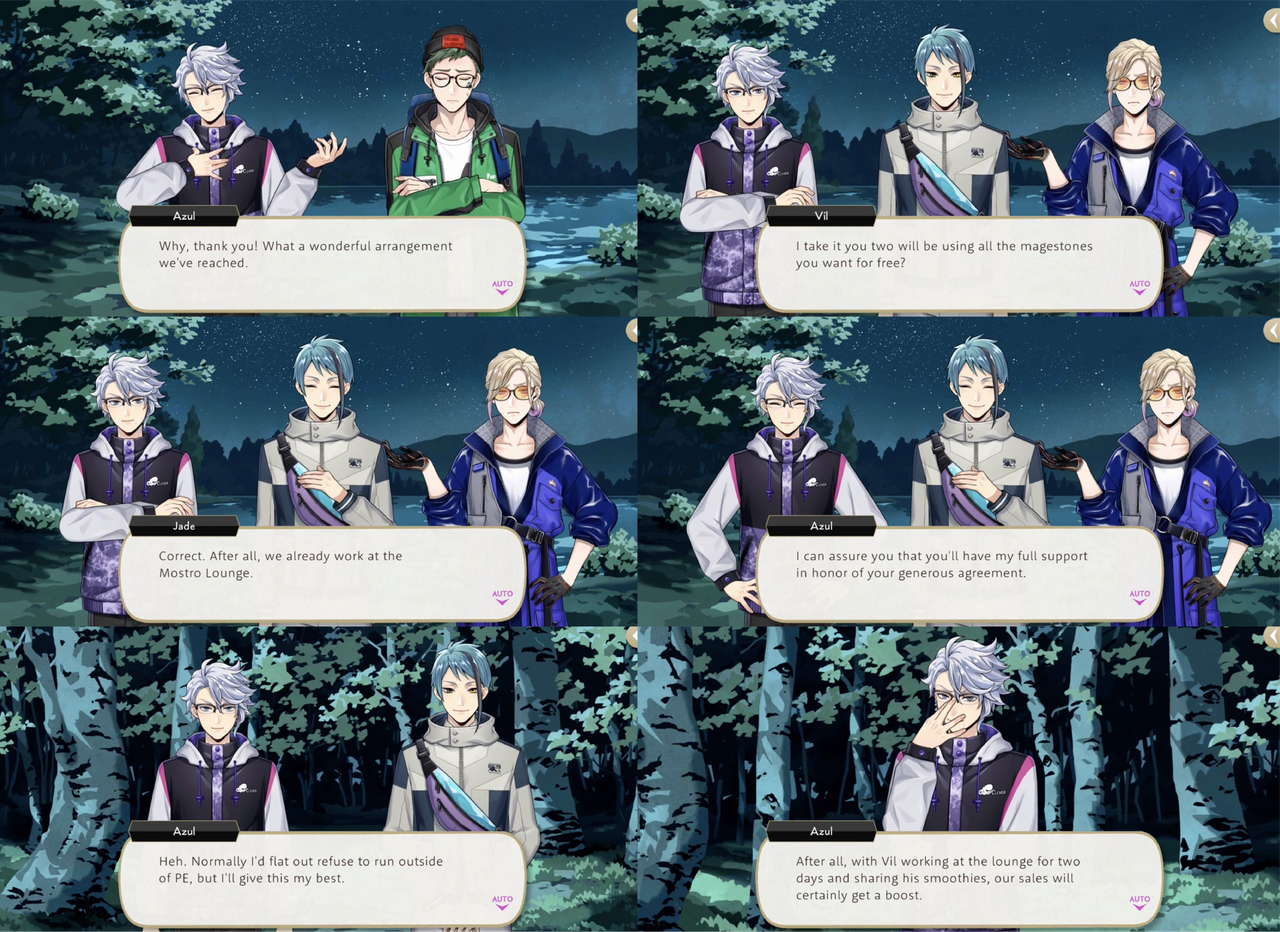 During Vargas Camp Azul refuses to save Vil an Trey from the Vargas Monster until they agree to volunteer at Mostro Lounge. Azul makes a show of haggling for Vil’s time, resulting in two days of labor and proceeds from Vil’s handmade, original smoothies, but it is then revealed that his true target was Trey: If we offer top-notch treats made by Trey himself, we’ll have a flood of customers pouring in!”