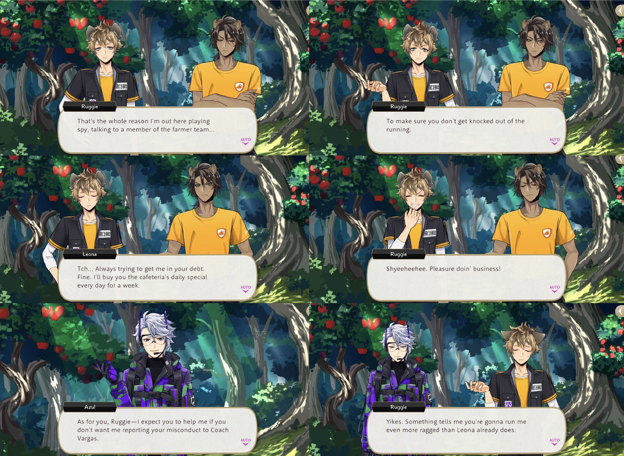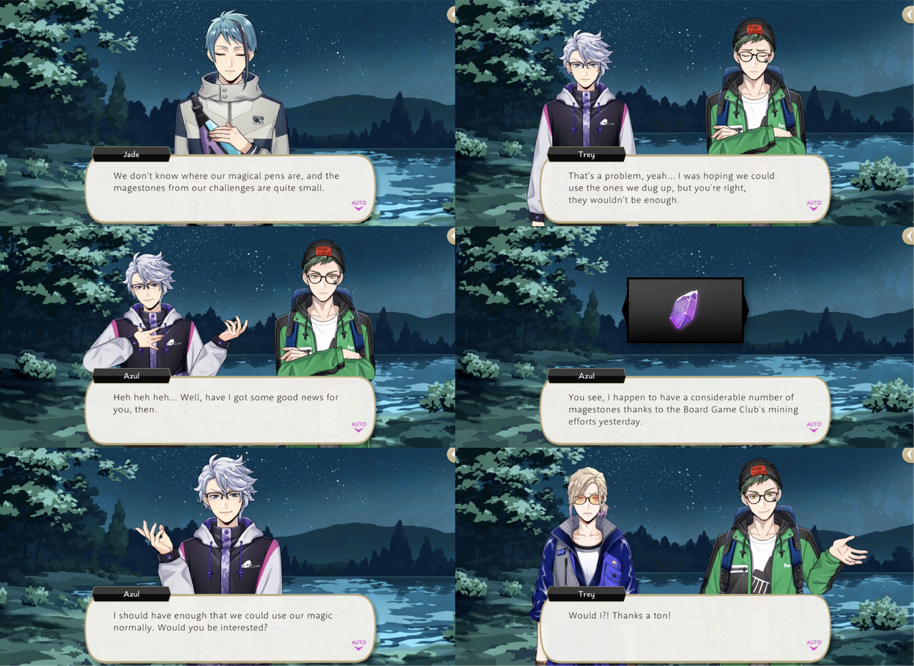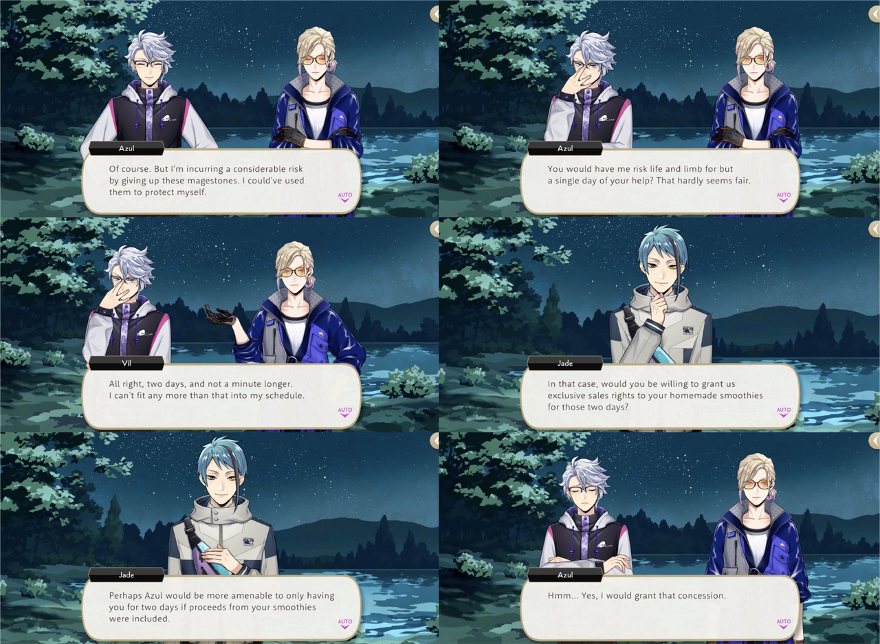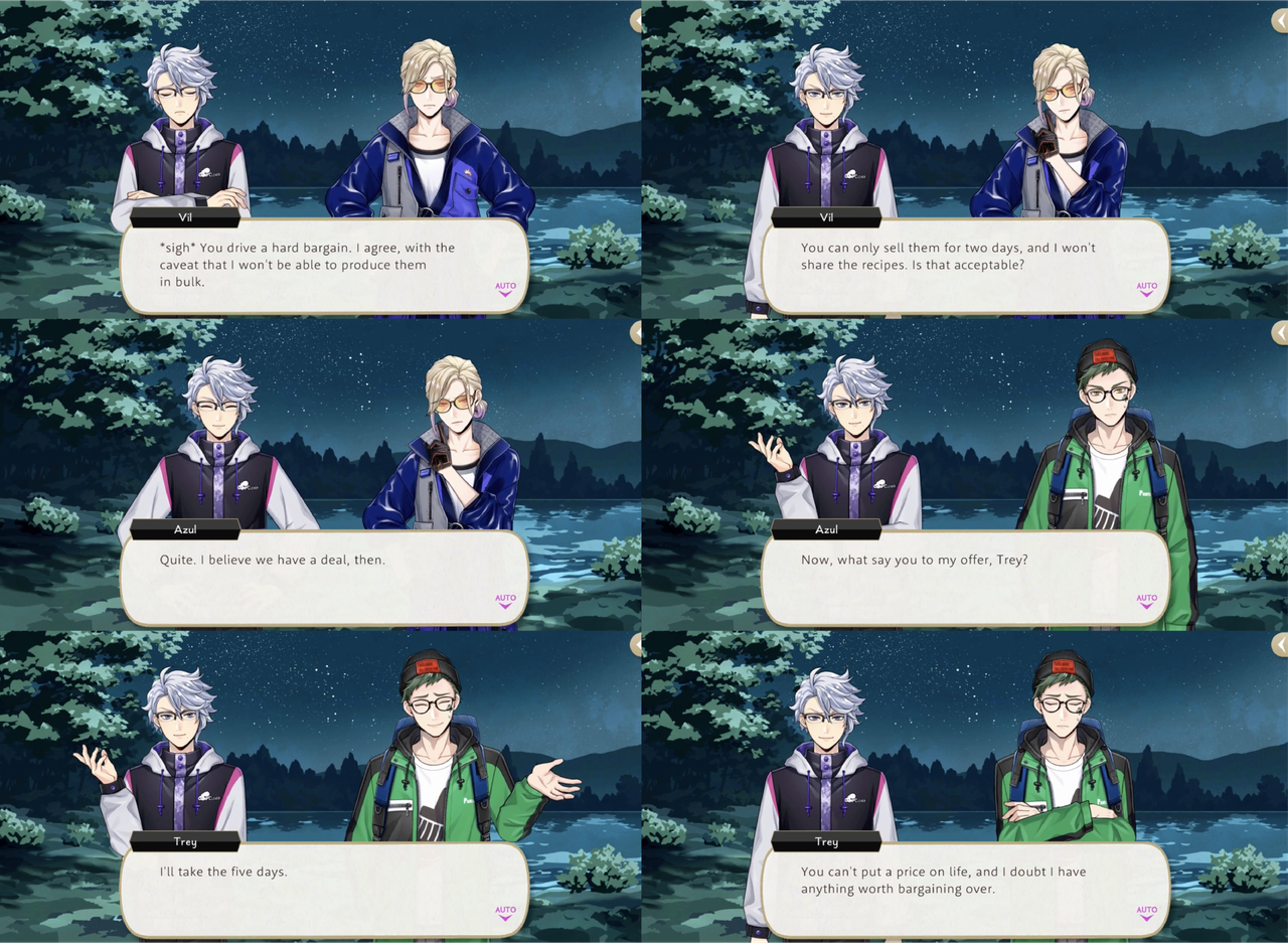 During Vargas Camp Azul refuses to save Vil an Trey from the Vargas Monster until they agree to volunteer at Mostro Lounge. Azul makes a show of haggling for Vil’s time, resulting in two days of labor and proceeds from Vil’s handmade, original smoothies, but it is then revealed that his true target was Trey: If we offer top-notch treats made by Trey himself, we’ll have a flood of customers pouring in!”