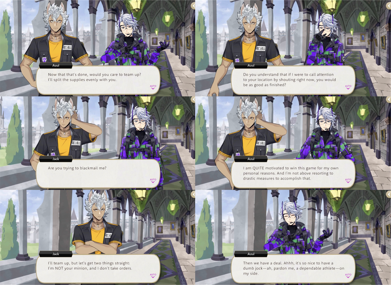 Azul also blackmails Jack into teaming with him during Beanfest by threatening to reveal his location to the enemy if Jack does not comply, and blackmails Ruggie into joining them both on the threat of revealing to Vargas that Ruggie had been bribed into protecting Leona, a member of the opposite team.