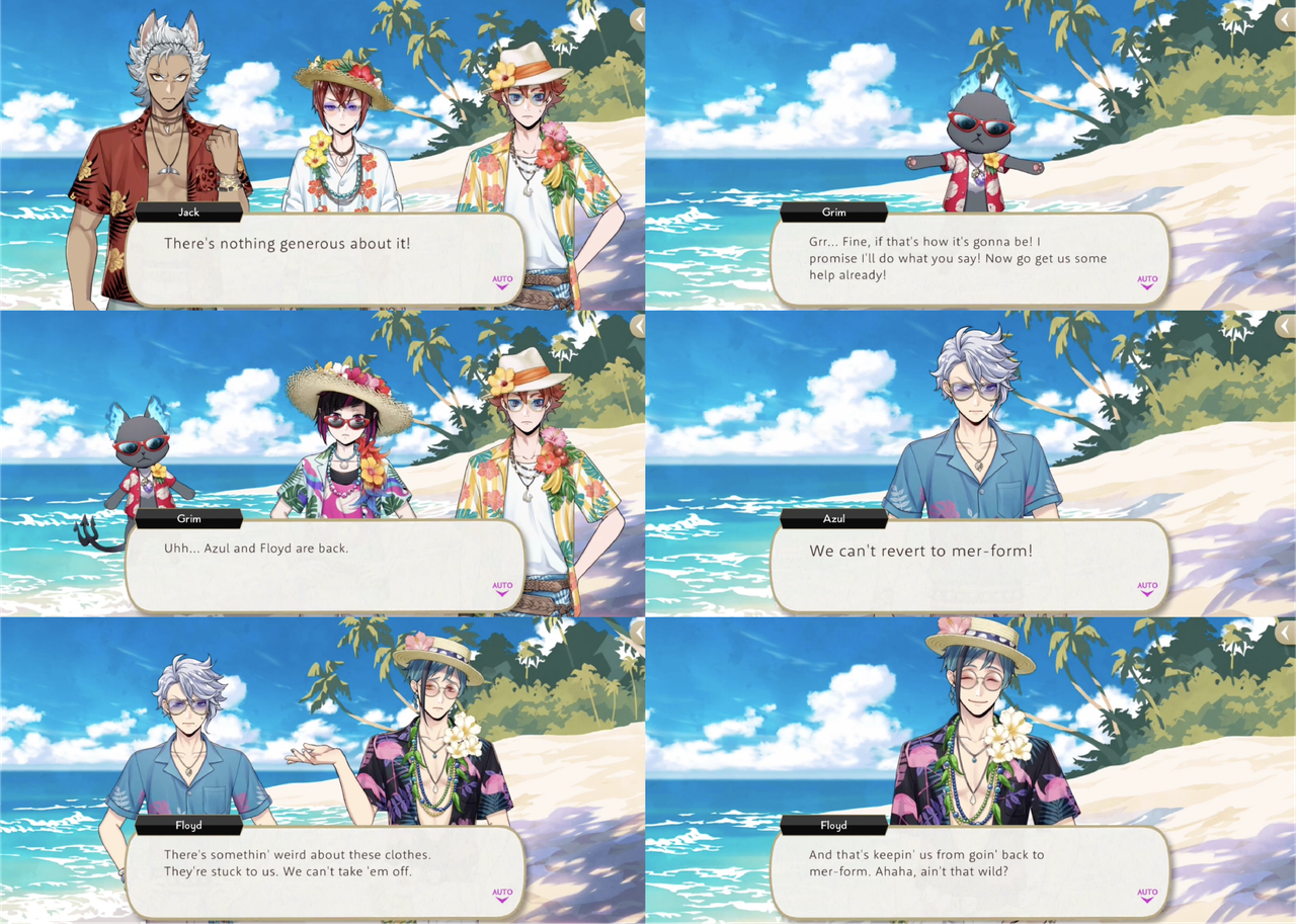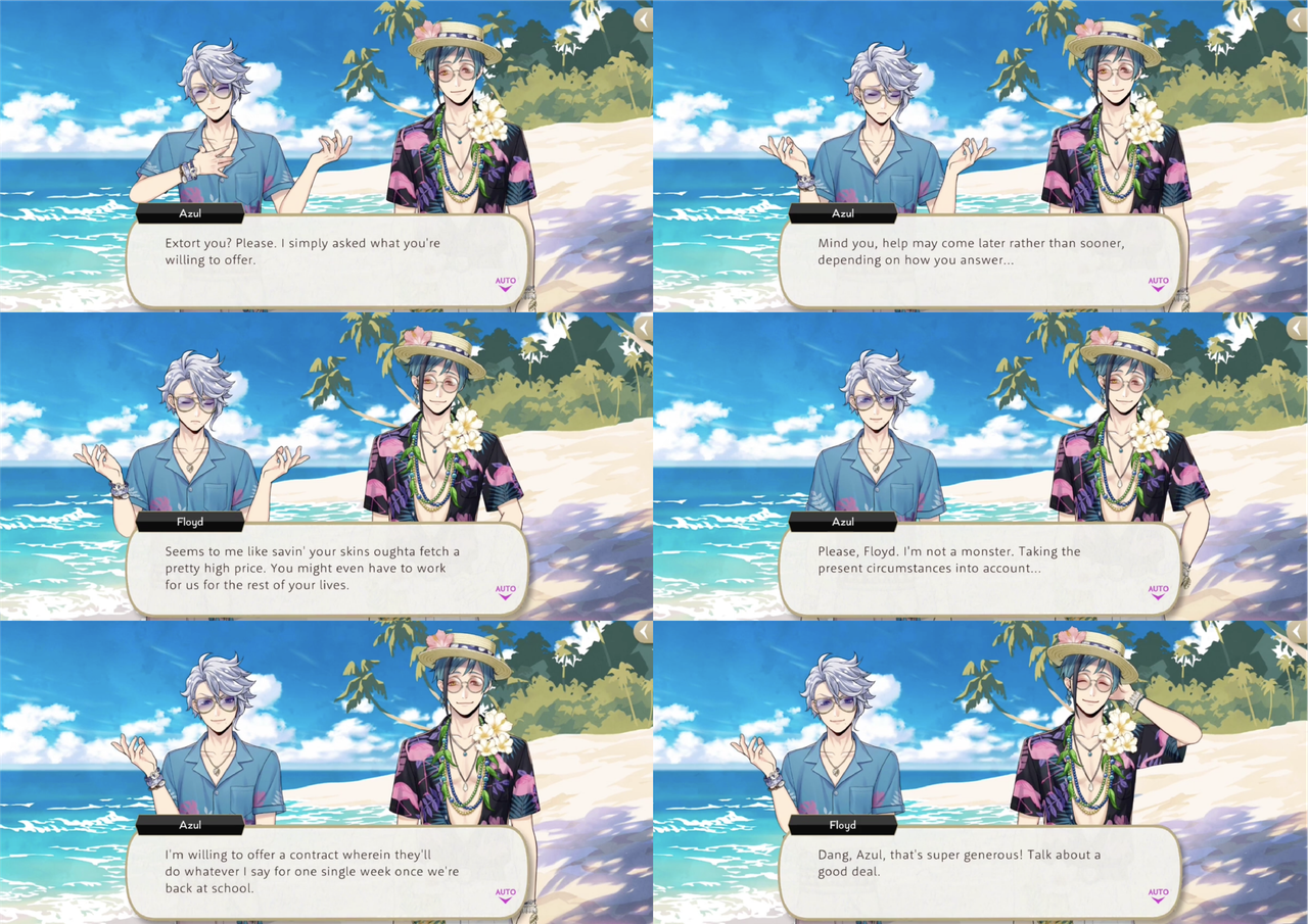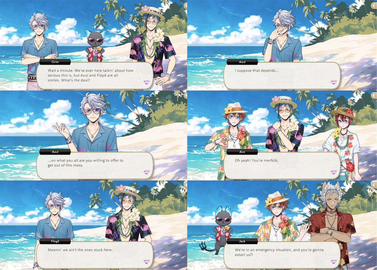During the Stitch event Azul attempts to blackmail the entire group into promising to do whatever he says for a week in exchange for rescuing them from the deserted island, but he is ultimately unable to fulfill his side of the deal when their clothes do not allow him or Floyd to revert to their original forms.