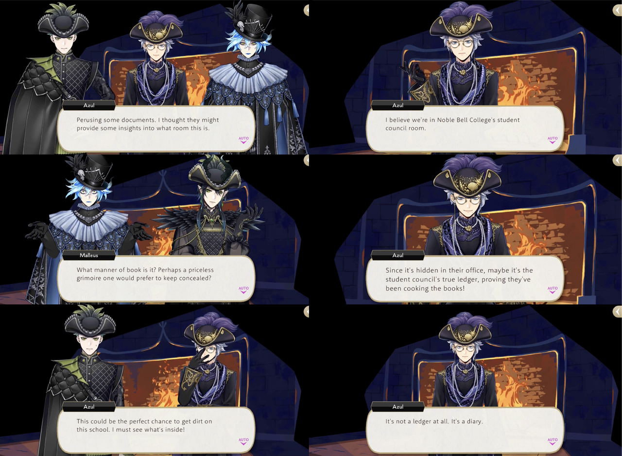 Azul is delighted to find Rollo’s diary in the student council room at Noble Bell College, saying, “Since it’s hidden in their office, maybe it’s the student council’s true ledger, proving they’ve been cooking the books! This could be the perfect chance to get dirt on this school. I must see what’s inside!,” but it proves to not be the potential for blackmail that he had possibly been anticipating.