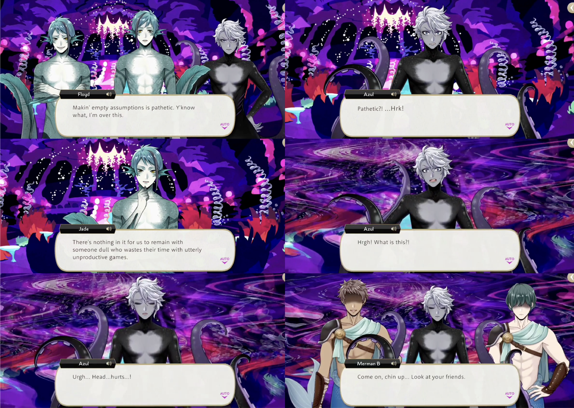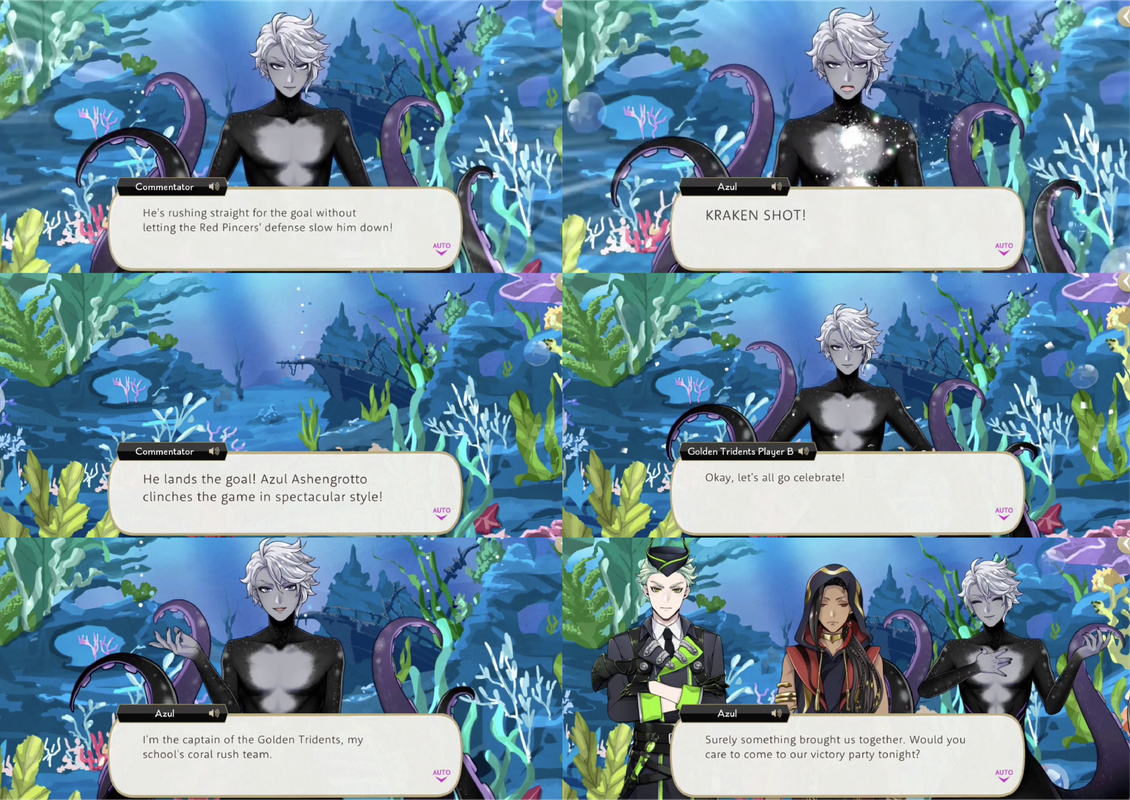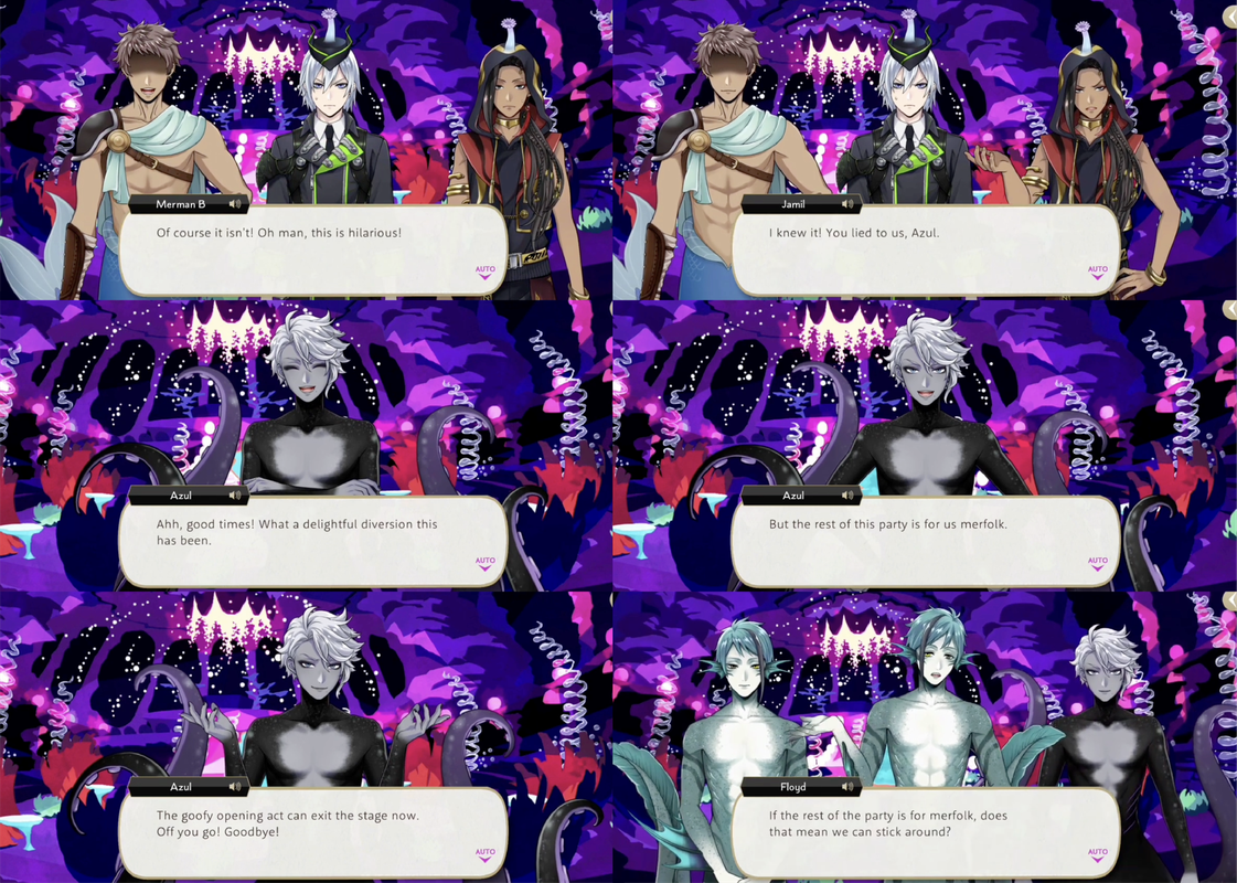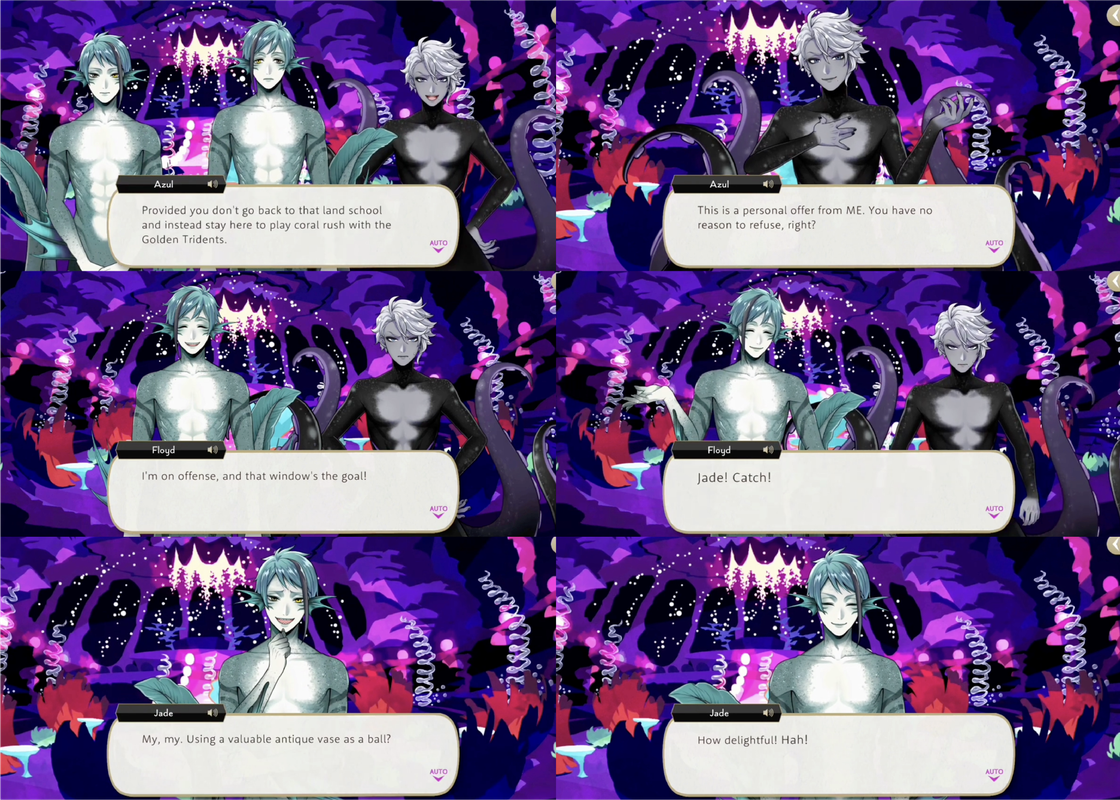 Azul then dismisses everyone except Jade and Floyd, saying that the remainder of the party is for mermaids only, and he expects the twins to stay under the sea and play coral rush for his team.