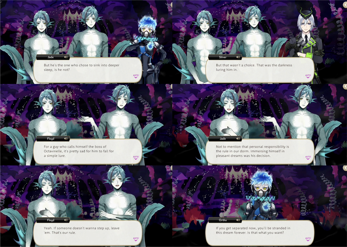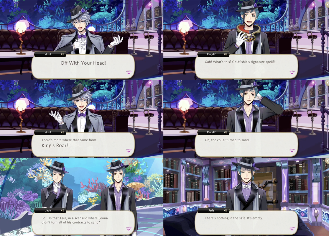 Jade and Floyd refuse to follow after Azul to save him, even after Ortho says that Azul may never be able to wake up, saying that he chose to sink into deeper sleep on his own. Silver says that this is not the case and he was lured in, but the twins still refuse, saying that personal responsibility is the rule on Octavinelle and immersing himself in pleasant dreams was Azul’s own decision.