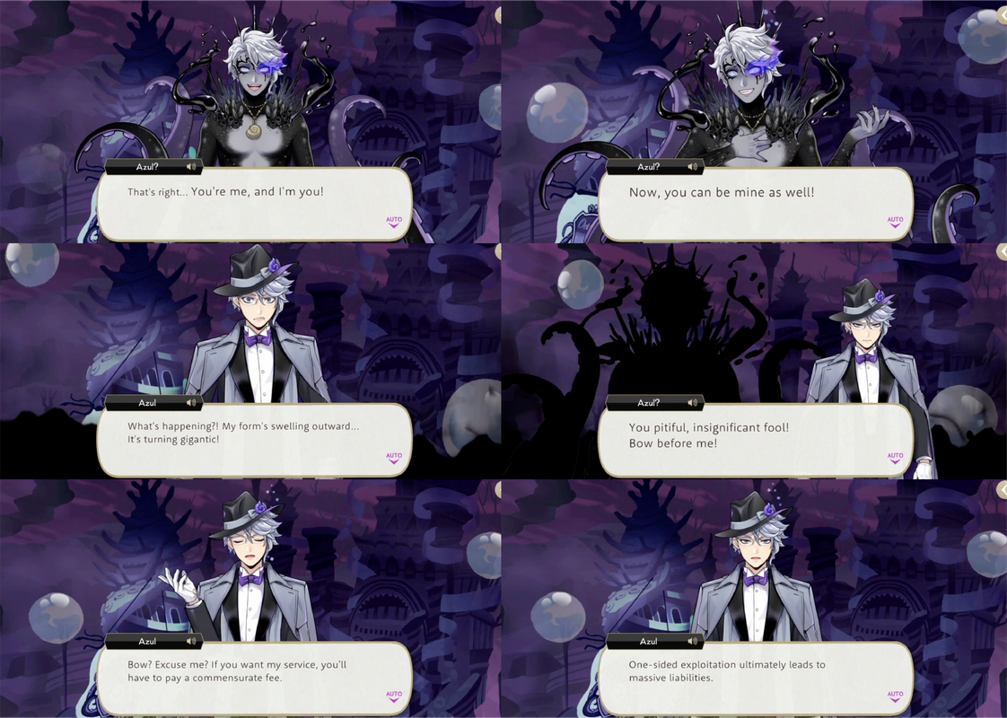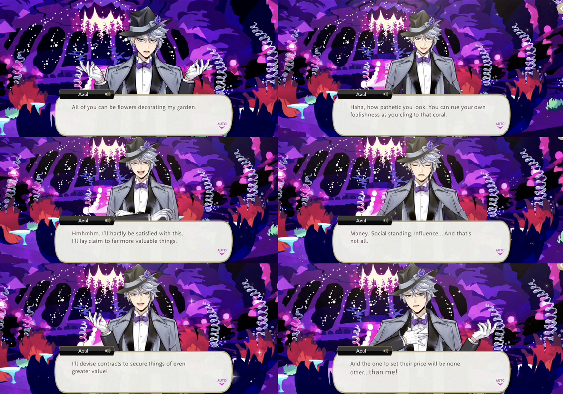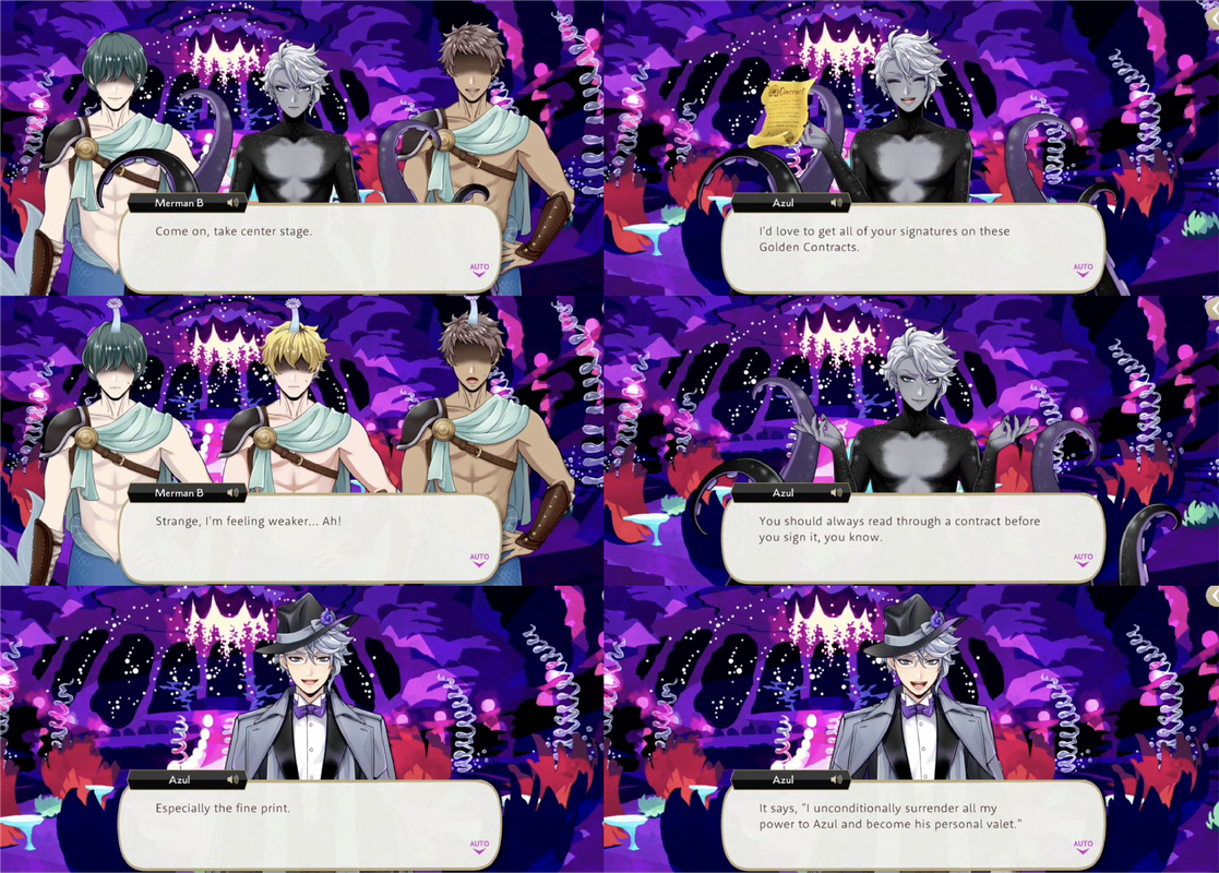 He distributes Golden Contracts for the mermaids of darkness to sign, with the fine print of, “I unconditionally surrender all my power to Azul and become his personal valet.”