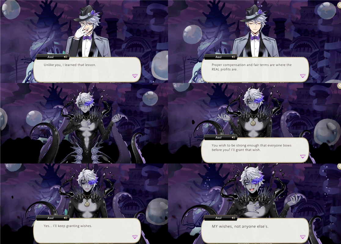 Azul declares that he will keep granting wishes, but his own, and not anyone else’s. He returns to his previous dream, which has reset at the point of his post-game victory party, but now he is awake.