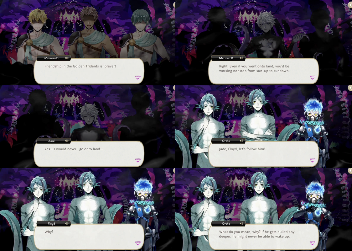 The mermaids of darkness populating the restaurant assure him that their friendship is forever, and if he went onto land he would be working all the time, and nothing is better than life under the sea. Azul responds that he would never go onto land and is dragged into darkness.