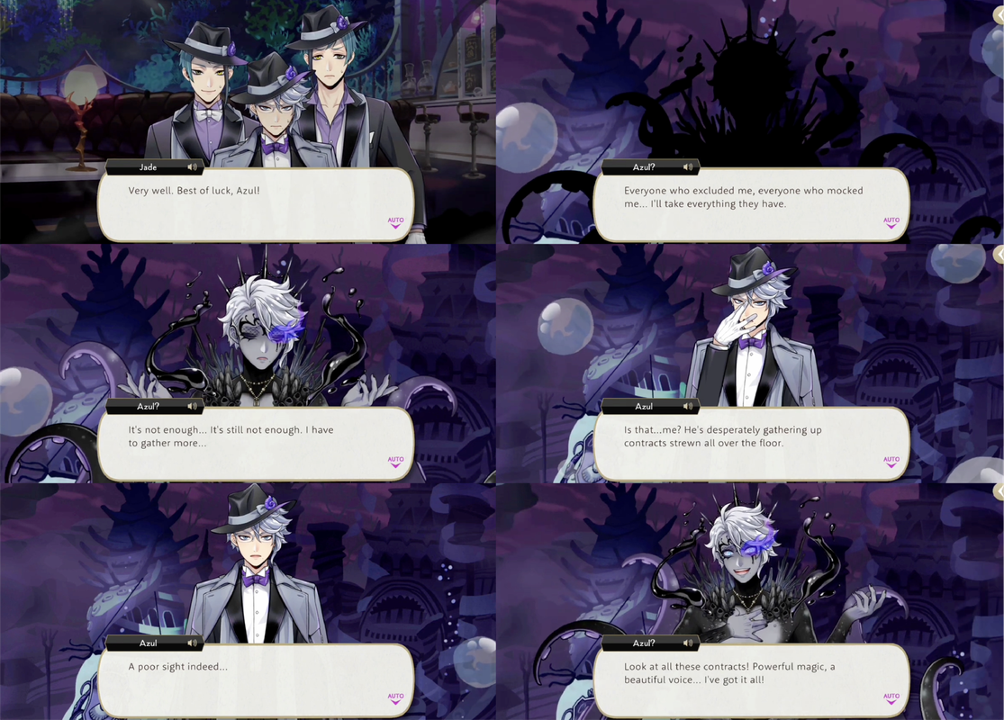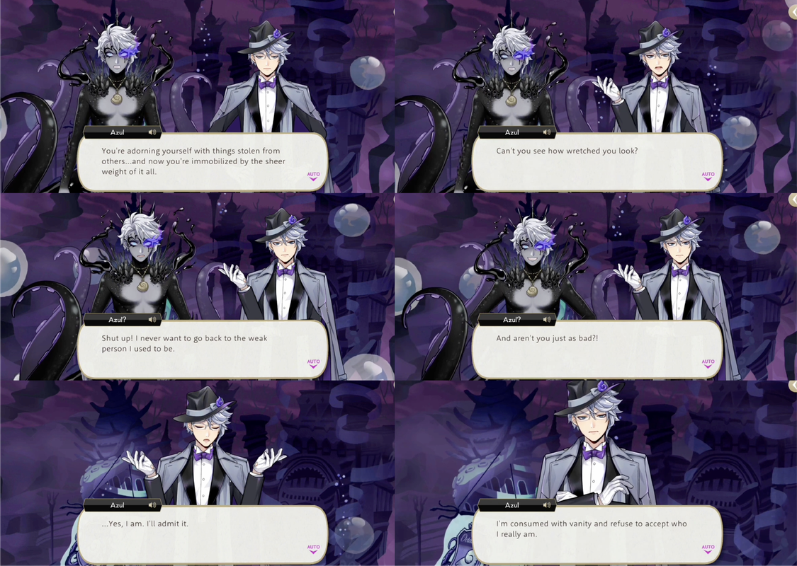 In the abyss Azul is met with the overblotted version of himself vowing to take everything from everyone who bullied him. Azul observes that the darkness-Azul has become immobilized by the weight of the things he has stolen out of desperation to not return to how weak he used to be, but admits that they are the same: “I’m consumed with vanity and refuse to accept who I really am.”