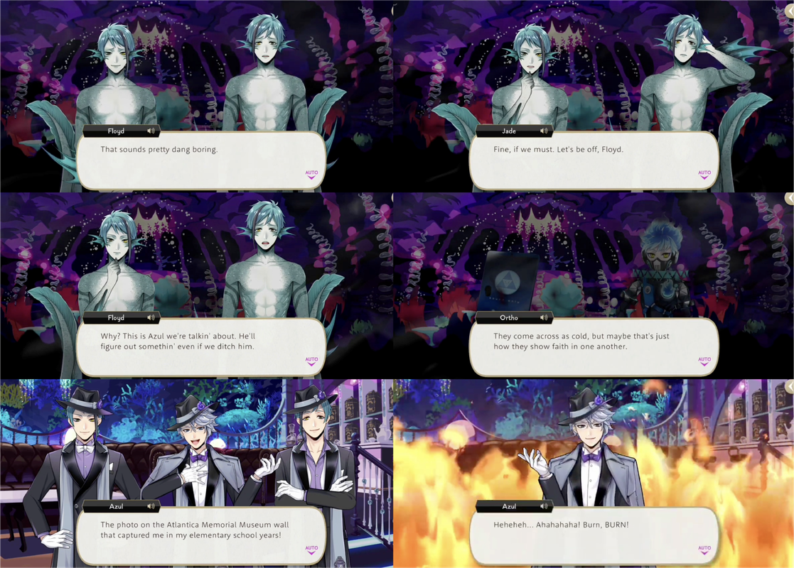 The twins acquiesce by beginning to play right where they are, tearing apart the party venue. Floyd calls Azul pathetic while Jade calls him dull, nearly reminding Azul of his overblot and nearly awakening him.