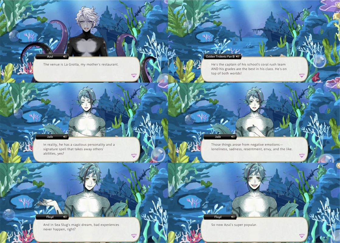 Jade explains, in reality, Azul has a cautious personality and unique magic that takes away the abilities of others, which were born from the negative emotion of loneliness, sadness, resentment, envy, etc. As bad experiences never happen in Malleus’ dream worlds Azul is now the popular captain of an undersea sports team.
