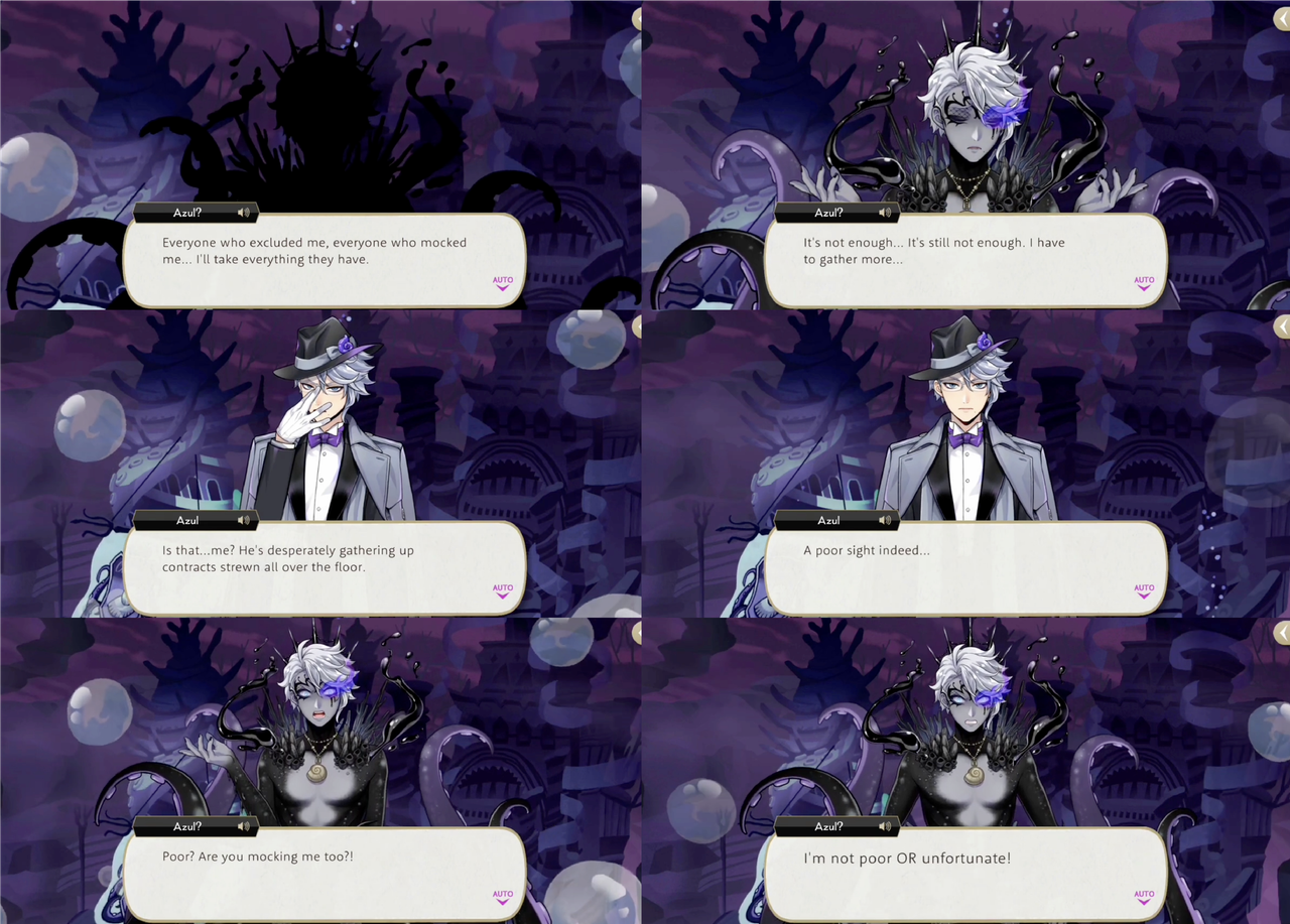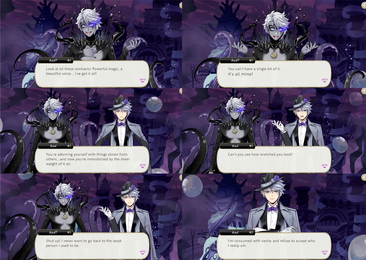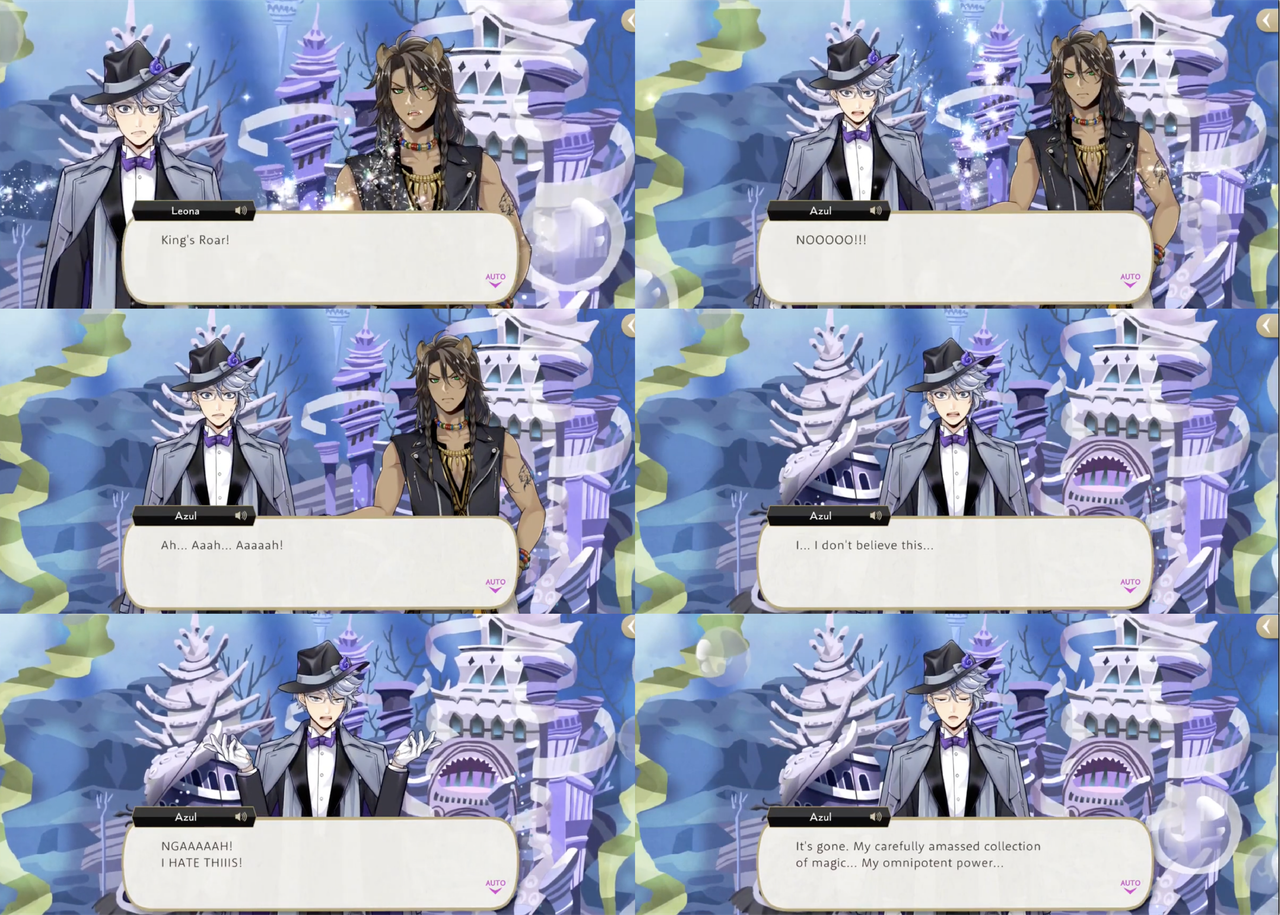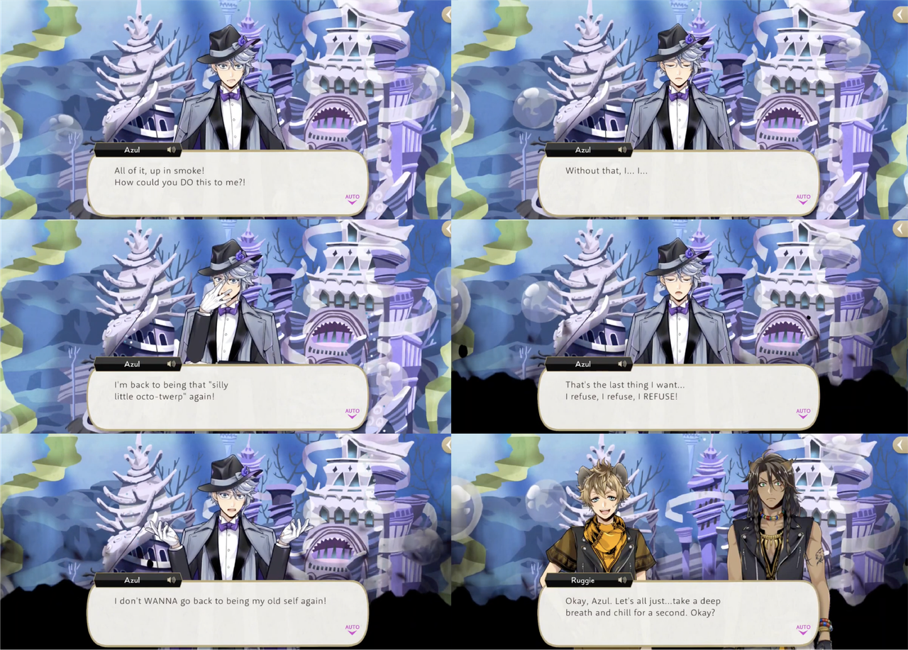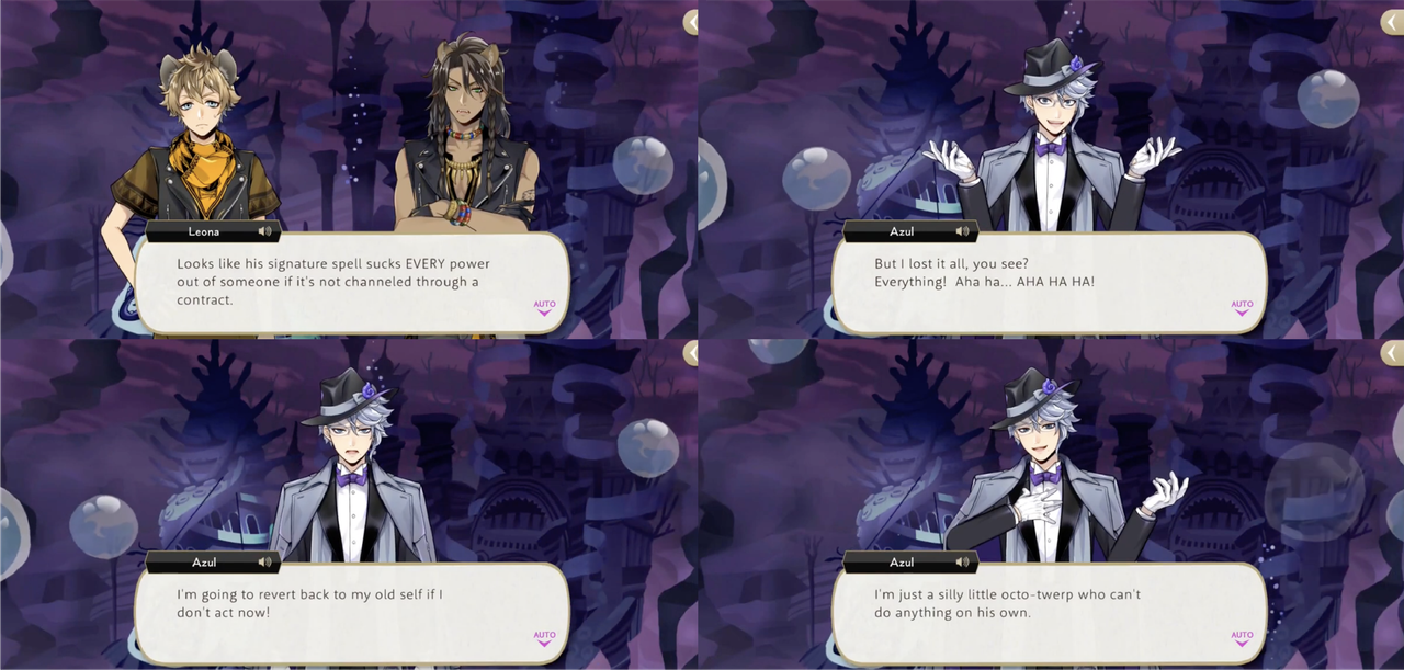 Fear of returning to the way he had been pre-NRC seems to be a strong contributor to Azul’s overblot. After Leona dissolves his contracts Azul’s response is to cry, “Without that, I…I…I’m back to being that ‘silly little octo-twerp’ again! That’s the last thing I want… I refuse, I refuse, I REFUSE! I don’t WANNA go back to being my old self again!”