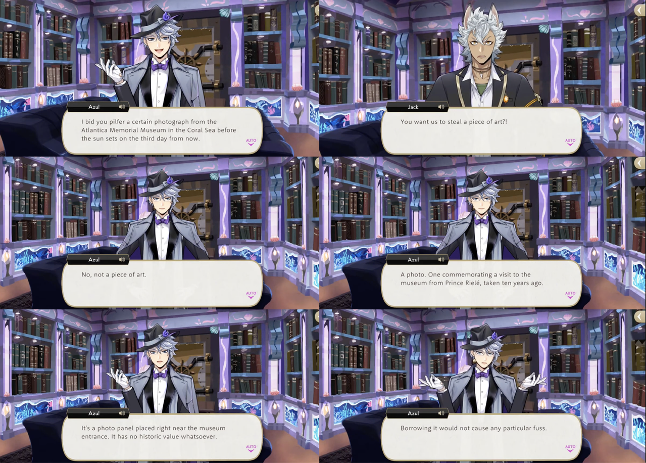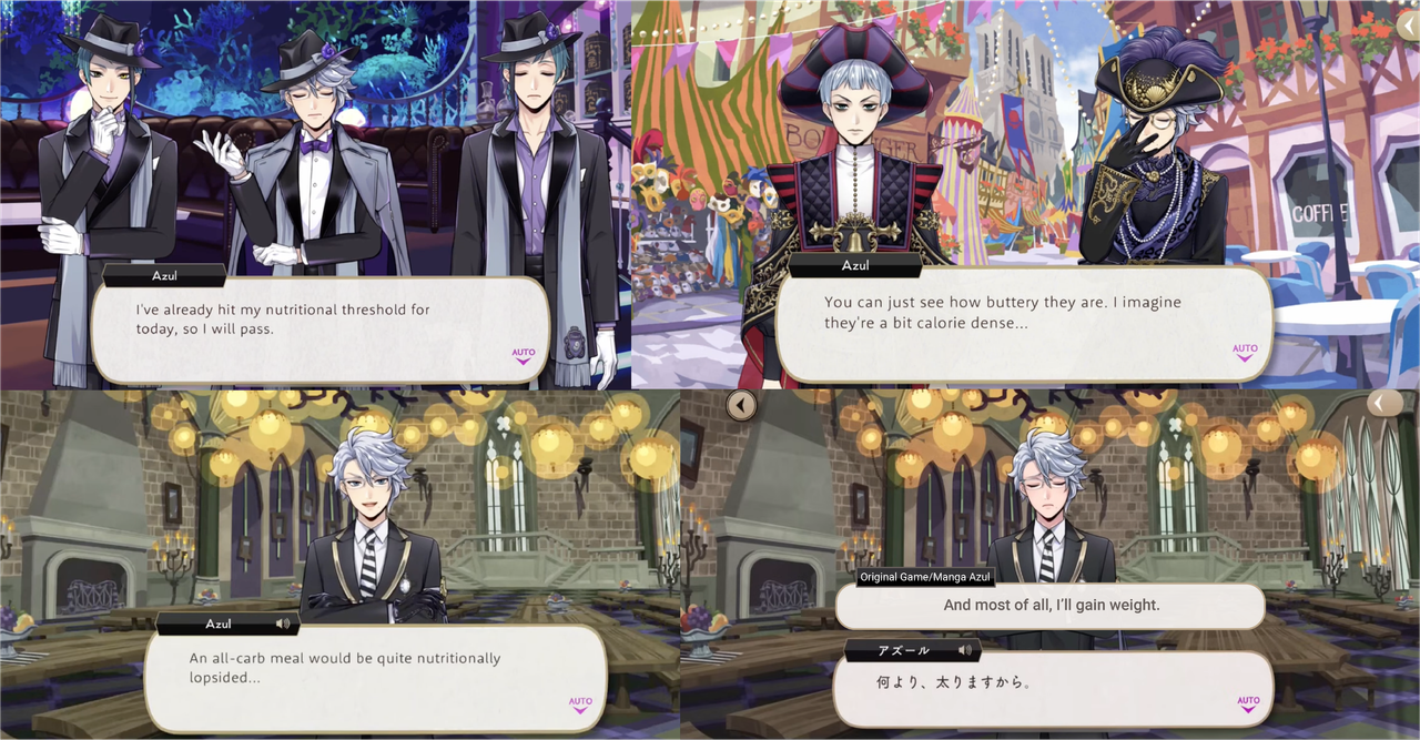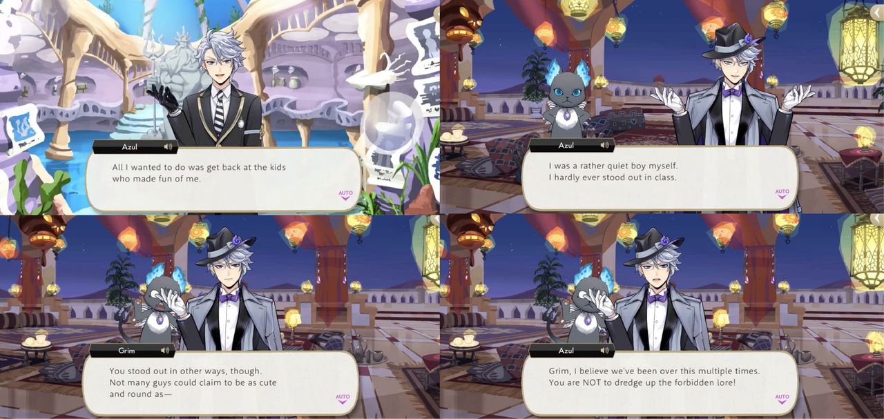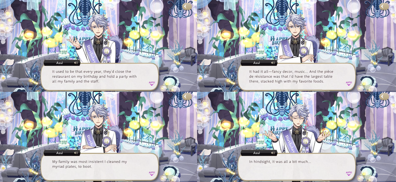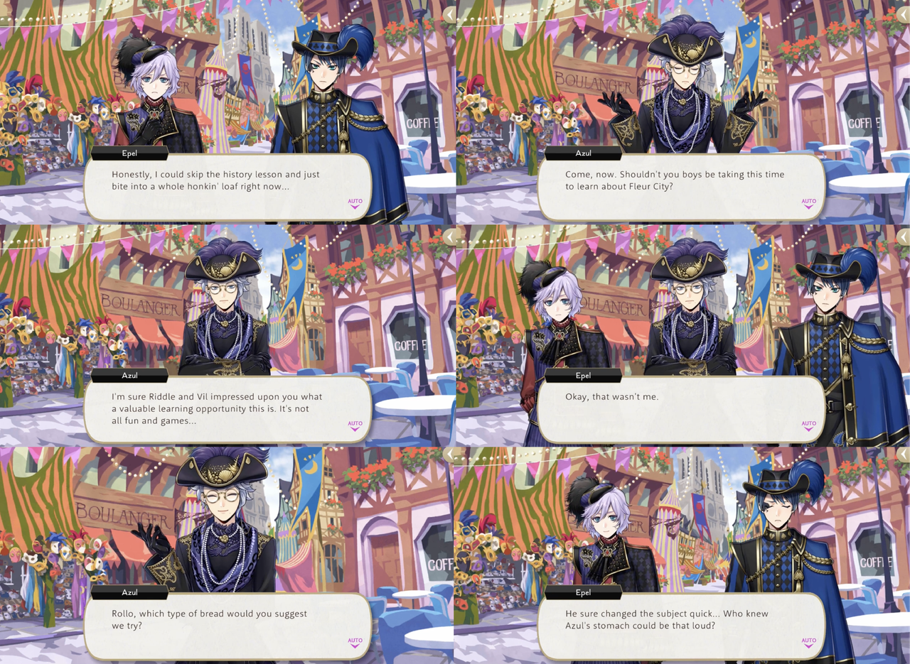During Glorious Masquerade Azul scolds Deuce and Epel for being more interested in food than a history lesson about the city, until his stomach growls, at which point he asks Rollo to recommend local bread (Epel: “He sure changed the subject quick…who knew Azul’s stomach could be that loud?”).
